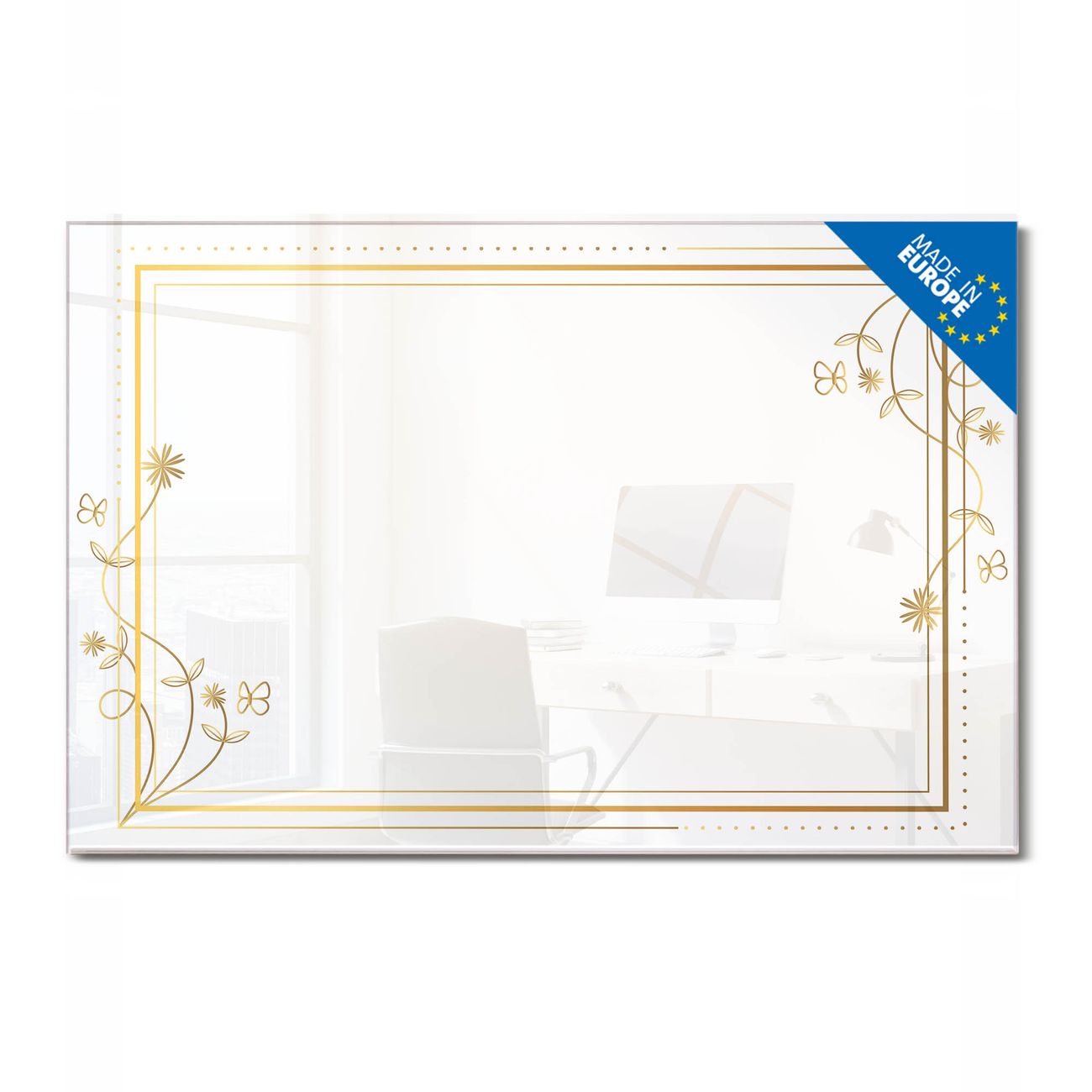 Material: 4mm Sicherheitsglas mit Metallrückwand Eigenschaften: beschreibbar, magnetisch, kratzfest Maße: 75x50x0,6cm, 5,63kg schwer Motiv Nummer 13541 Floraler Rahmen 2 Zubehör: inklusive 4 Neodym-Magnete
