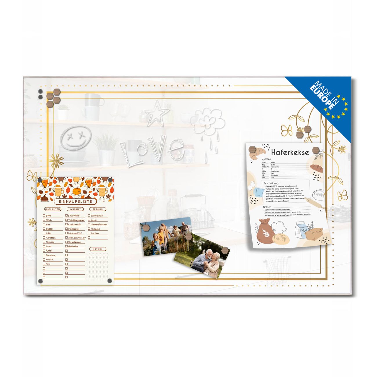 Ein Stück Design, das Ihren Alltag organisiert. Schreiben, heften, inspirieren - alles an einem Ort. Qualität, die man spürt. Montage leicht gemacht. Handwerk mit Herz - veredelt in Sachsen. Einzigartiges Design mit Motiv Motiv Floraler Rahmen 2 Beschreibbare Glasoberfläche, leicht zu reinigen Starke Magnetkraft durch Stahlrückwand Inklusive 4 Neodym-Magneten Flexible Montageoptionen Handveredelt in Sachsen - Qualität, die bleibt