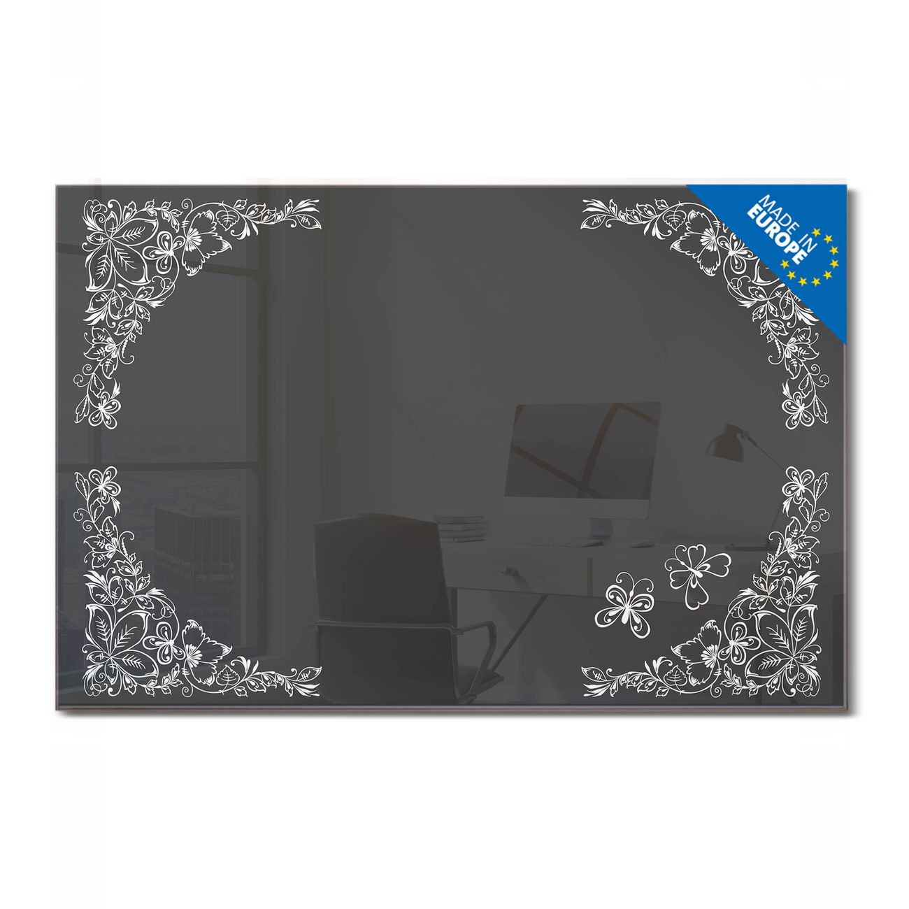 Material: 4mm Sicherheitsglas mit Metallrückwand Eigenschaften: beschreibbar, magnetisch, kratzfest Maße: 75x50x0,6cm, 5,63kg schwer Motiv Nummer 13547 Floraler Rahmen 3 Zubehör: inklusive 4 Neodym-Magnete