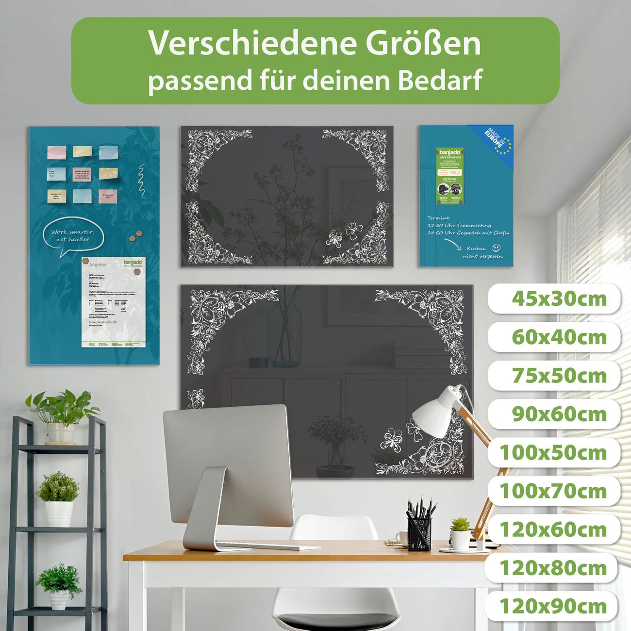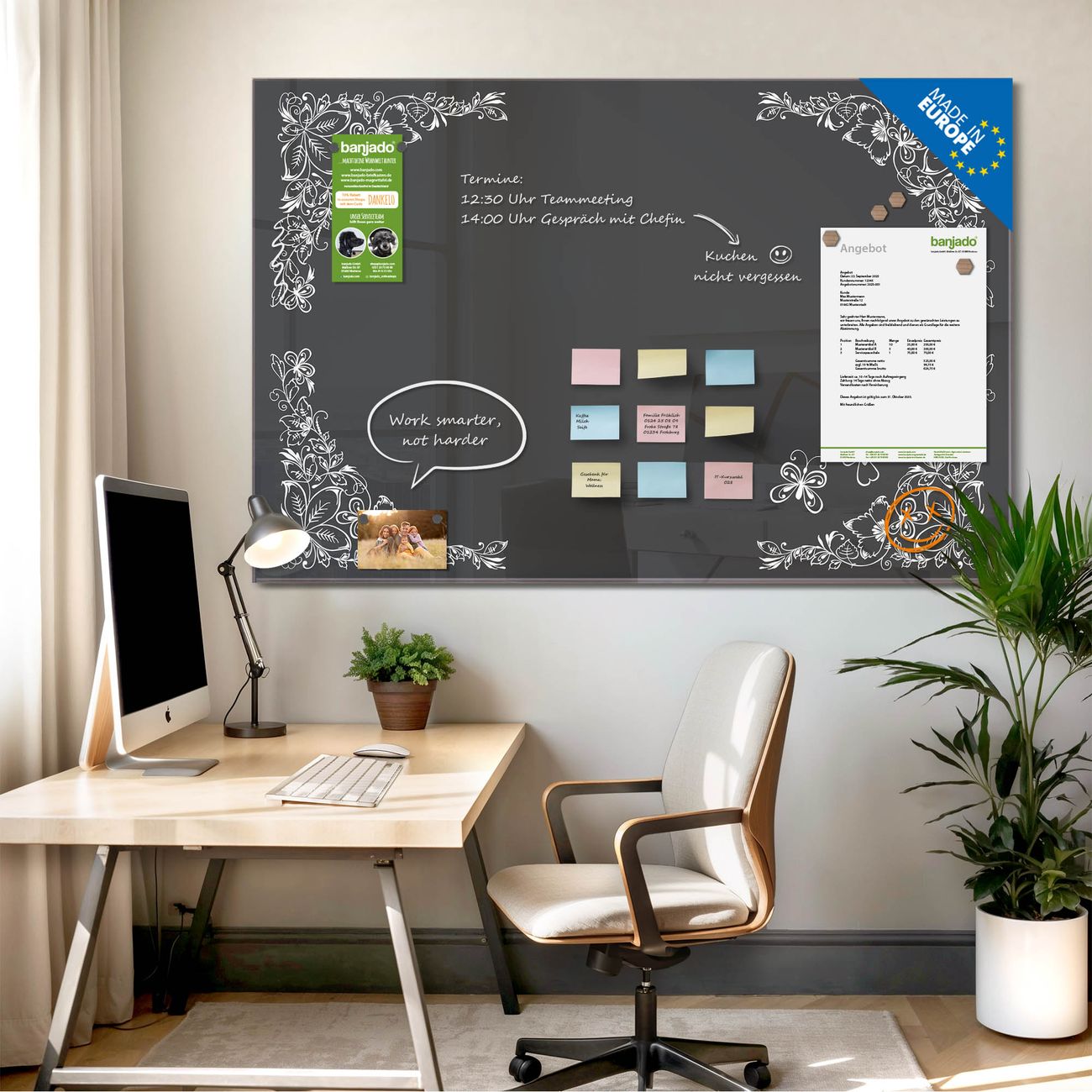 Jede Glas Magnettafel wird in unserer Werkstatt von Hand gefertigt und sorgfältig geprüft. So erhalten Sie ein echtes Qualitätsprodukt, das Funktion und Ästhetik perfekt vereint.?? Warum banjado?