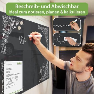 Auf der glatten Glasoberfläche lassen sich Termine, Rezepte oder Notizen ganz einfach mit Kreidestiften festhalten und rückstandslos entfernen. Starke Neodym-Magnete halten Ihre wichtigsten Erinnerungen sicher an Ort und Stelle. So entsteht Ihre ganz persönliche Ideenwand - jeden Tag neu.