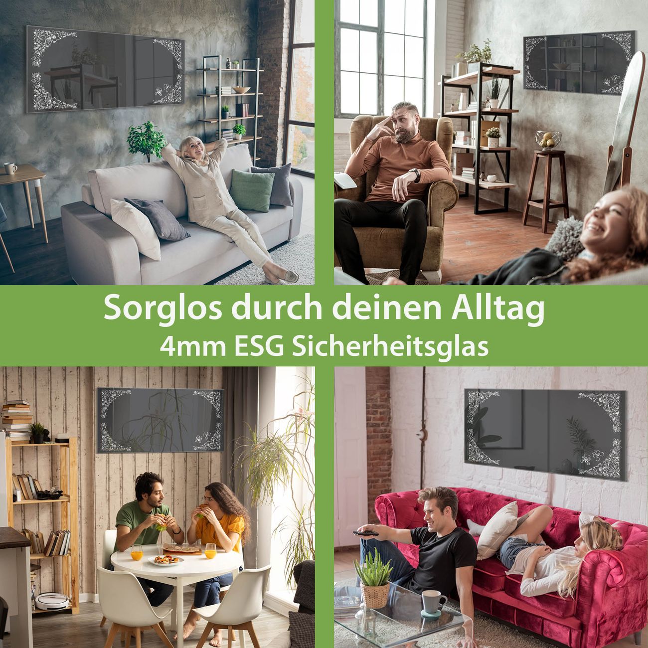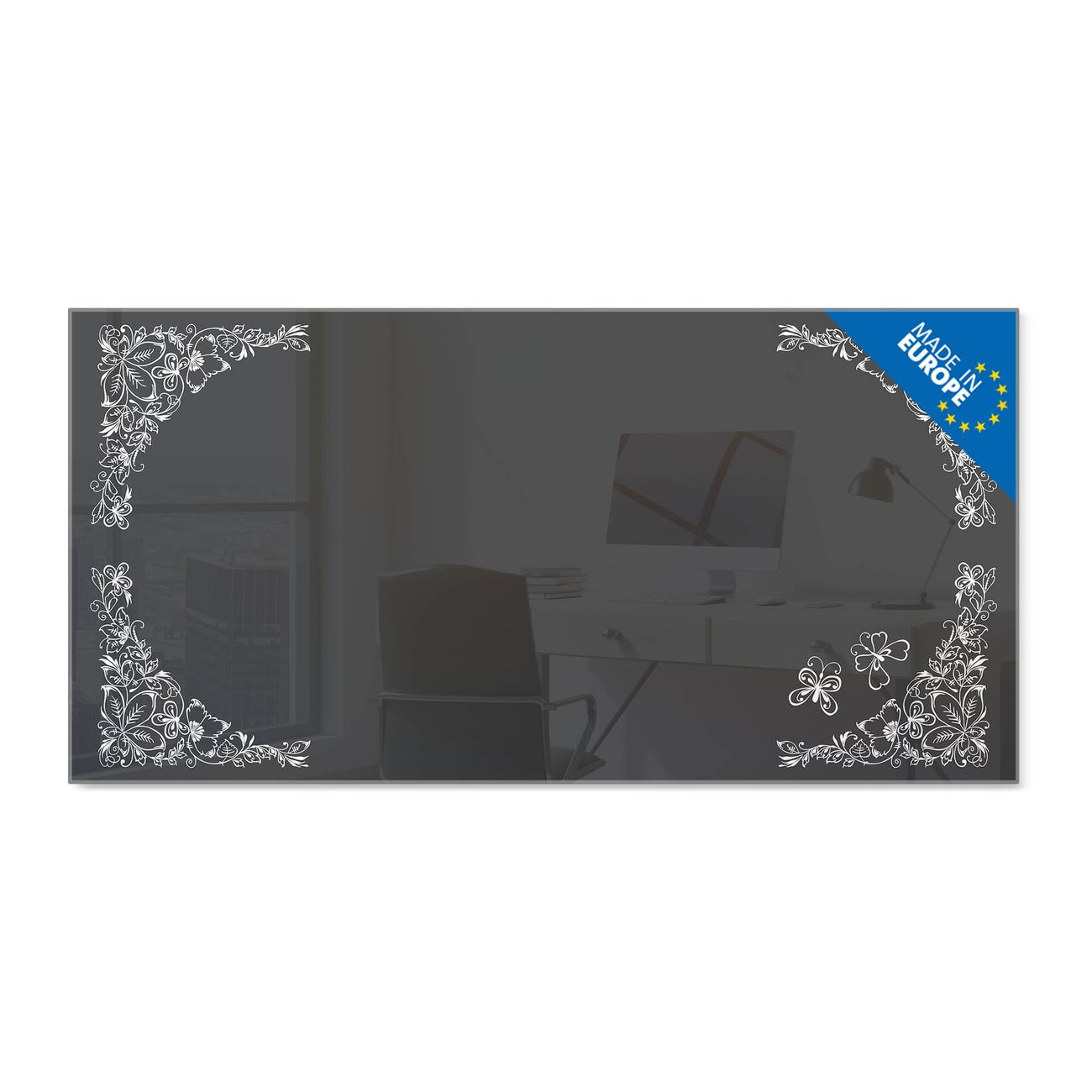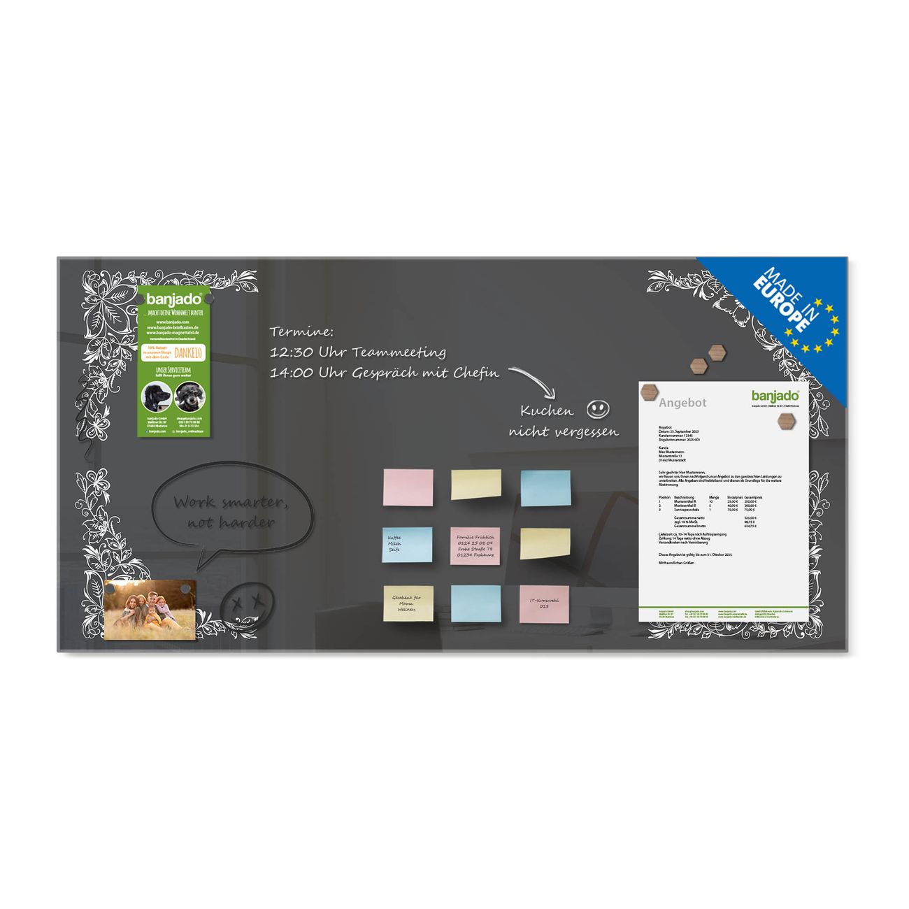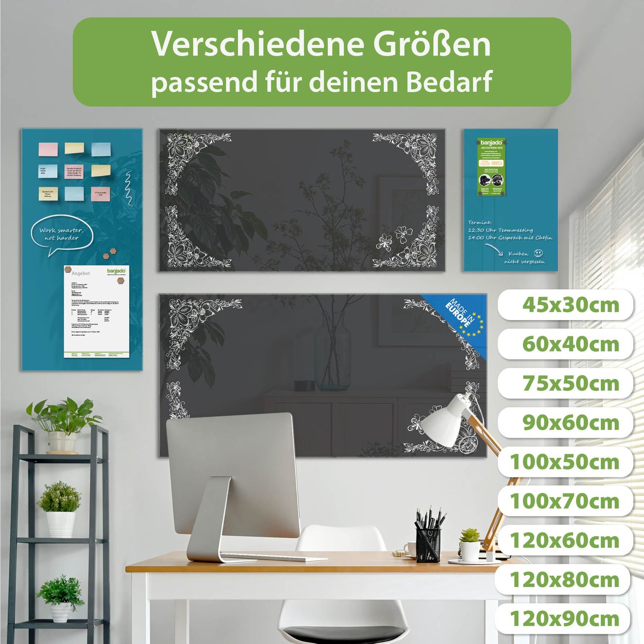 Material: 4mm Sicherheitsglas mit Metallrückwand Eigenschaften: beschreibbar, magnetisch, kratzfest Maße: 100x50x0,6cm, 7,50kg schwer Motiv Nummer 13547 Floraler Rahmen 3 Zubehör: inklusive 4 Neodym-Magnete