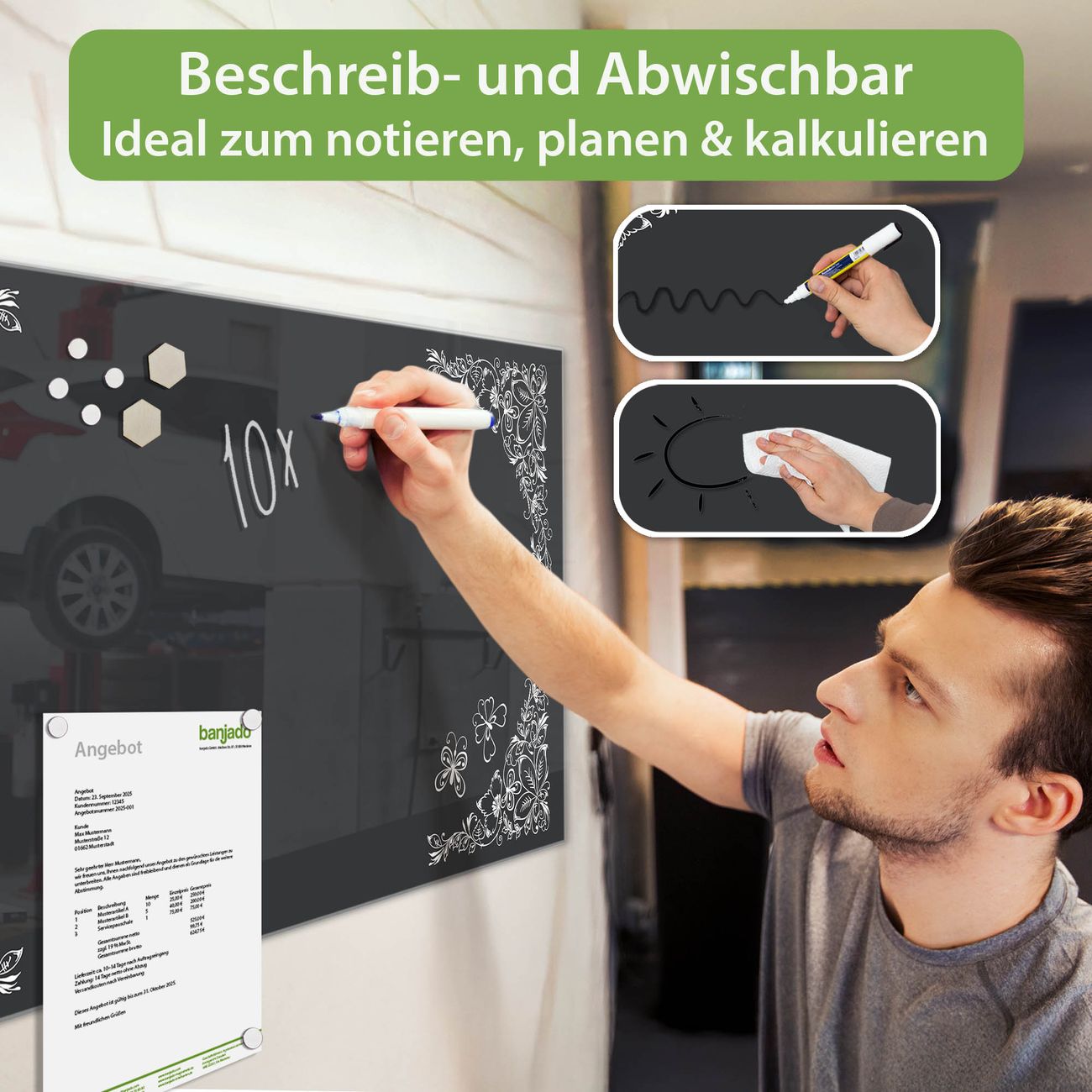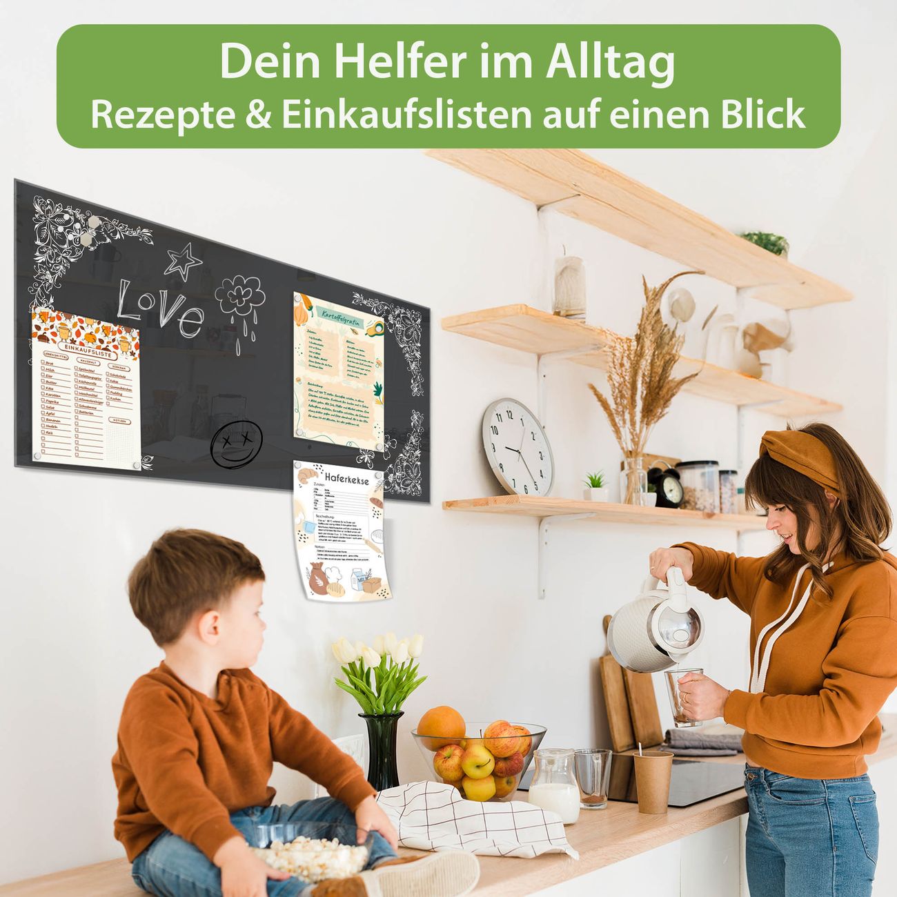 Auf der glatten Glasoberfläche lassen sich Termine, Rezepte oder Notizen ganz einfach mit Kreidestiften festhalten und rückstandslos entfernen. Starke Neodym-Magnete halten Ihre wichtigsten Erinnerungen sicher an Ort und Stelle. So entsteht Ihre ganz persönliche Ideenwand - jeden Tag neu.