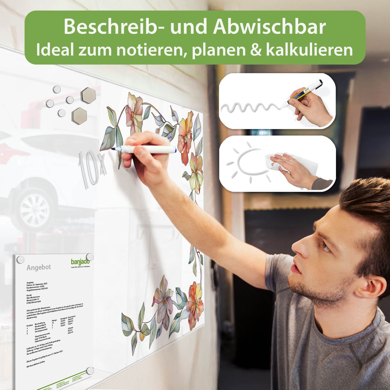 Die banjado Glas Magnettafel mit dem Motiv Motiv Florales Kunstwerk verbindet Funktionalität mit Stil. Sie ersetzt das Zettelchaos durch klare Strukturen und bringt dabei eine warme, natürliche Atmosphäre in Ihr Zuhause. Ob im Büro, in der Küche oder im Eingangsbereich - dieses Design-Board zieht Blicke an und sorgt für Ordnung mit Charakter.