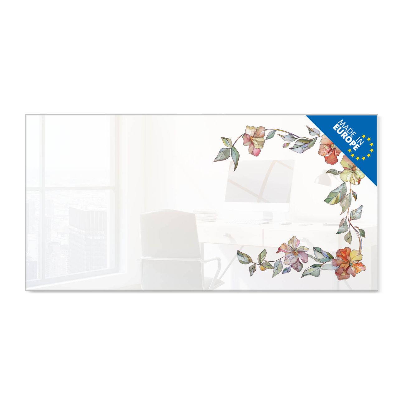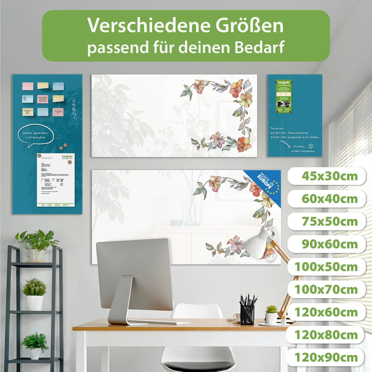 Material: 4mm Sicherheitsglas mit Metallrückwand Eigenschaften: beschreibbar, magnetisch, kratzfest Maße: 100x50x0,6cm, 7,50kg schwer Motiv Nummer 13509 Florales Kunstwerk Zubehör: inklusive 4 Neodym-Magnete