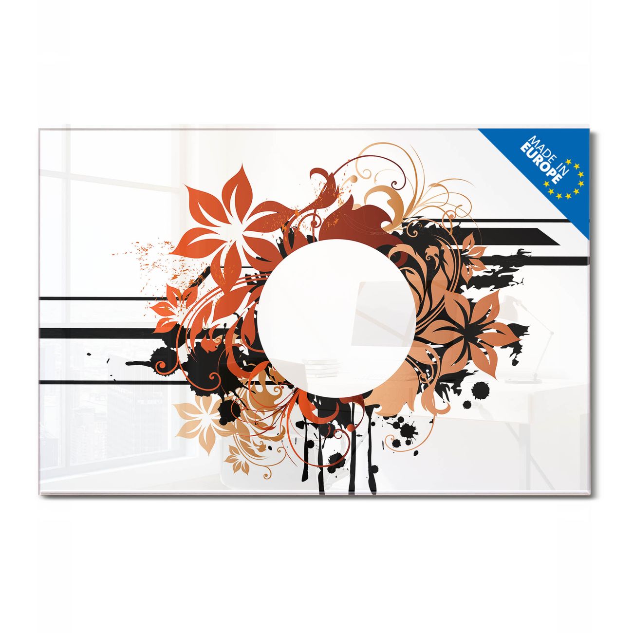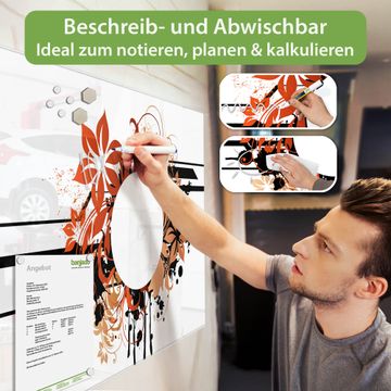 Material: 4mm Sicherheitsglas mit Metallrückwand Eigenschaften: beschreibbar, magnetisch, kratzfest Maße: 75x50x0,6cm, 5,63kg schwer Motiv Nummer 13233 Florales Ornament 2 Zubehör: inklusive 4 Neodym-Magnete