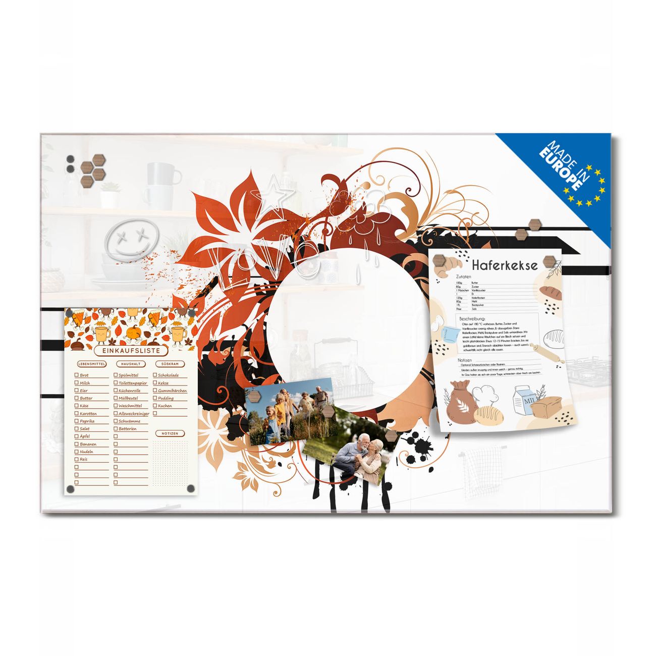 Auf der glatten Glasoberfläche lassen sich Termine, Rezepte oder Notizen ganz einfach mit Kreidestiften festhalten und rückstandslos entfernen. Starke Neodym-Magnete halten Ihre wichtigsten Erinnerungen sicher an Ort und Stelle. So entsteht Ihre ganz persönliche Ideenwand - jeden Tag neu.