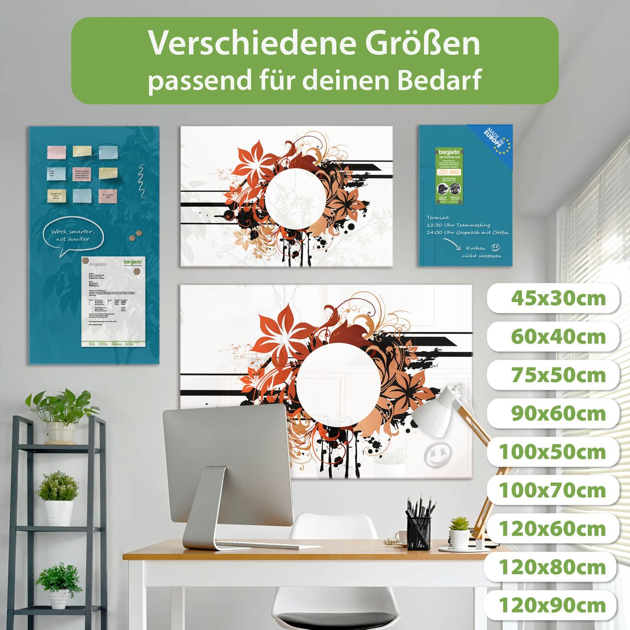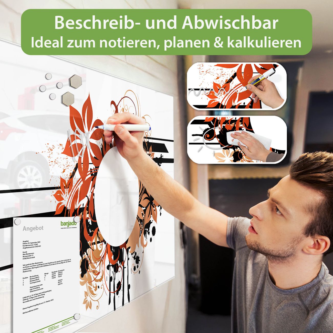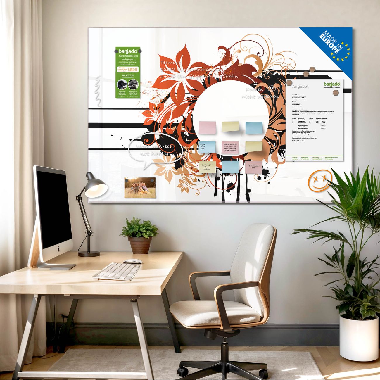 Jede Glas Magnettafel wird in unserer Werkstatt von Hand gefertigt und sorgfältig geprüft. So erhalten Sie ein echtes Qualitätsprodukt, das Funktion und Ästhetik perfekt vereint.?? Warum banjado?