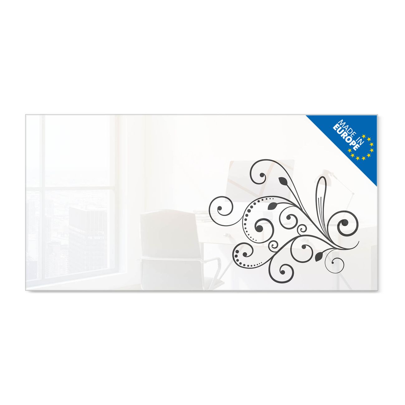 Material: 4mm Sicherheitsglas mit Metallrückwand Eigenschaften: beschreibbar, magnetisch, kratzfest Maße: 100x50x0,6cm, 7,50kg schwer Motiv Nummer 13219 Florales Ornament Zubehör: inklusive 4 Neodym-Magnete