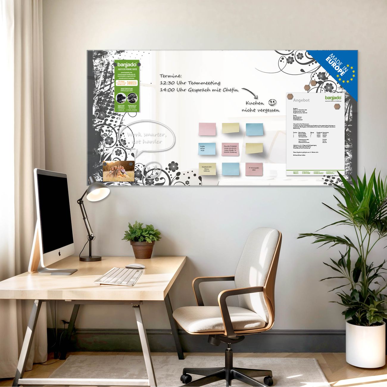 Die banjado Glas Magnettafel mit dem Motiv Motiv Florales Schwarz-Weiß Muster verbindet Funktionalität mit Stil. Sie ersetzt das Zettelchaos durch klare Strukturen und bringt dabei eine warme, natürliche Atmosphäre in Ihr Zuhause. Ob im Büro, in der Küche oder im Eingangsbereich - dieses Design-Board zieht Blicke an und sorgt für Ordnung mit Charakter.