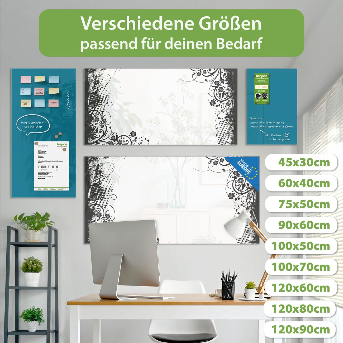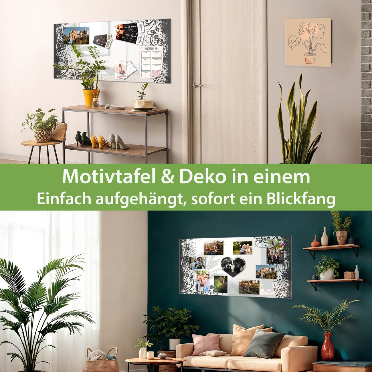 Material: 4mm Sicherheitsglas mit Metallrückwand Eigenschaften: beschreibbar, magnetisch, kratzfest Maße: 120x60x0,6cm, 10,80kg schwer Motiv Nummer 13563 Florales Schwarz-Weiß Muster Zubehör: inklusive 4 Neodym-Magnete