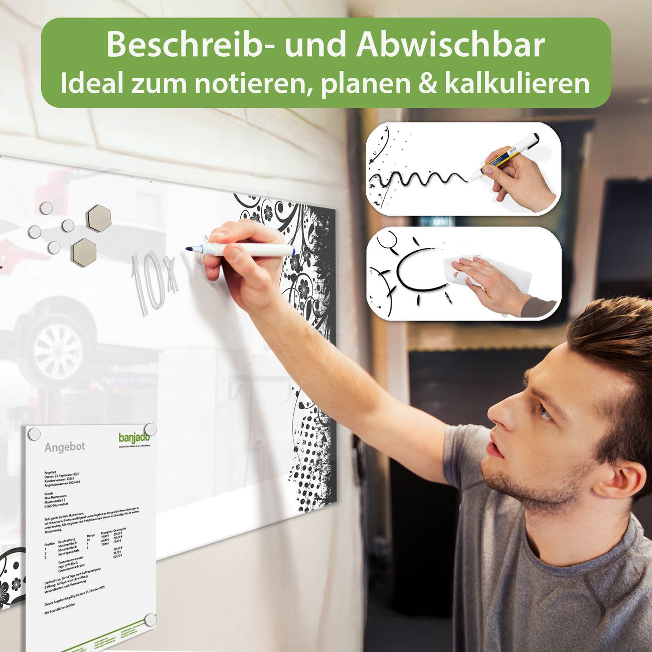 Bitte beachten Sie, dass ausschliessliche spezielle Magnete an der Glastafel haften. Wir empfehlen banjado Neodym Magnete, diese sind durch uns auf Wirksamkeit geprüft.