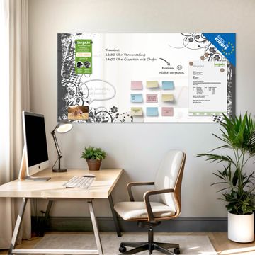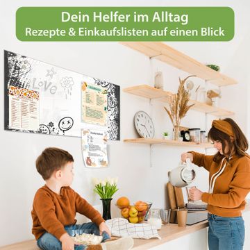 Auf der glatten Glasoberfläche lassen sich Termine, Rezepte oder Notizen ganz einfach mit Kreidestiften festhalten und rückstandslos entfernen. Starke Neodym-Magnete halten Ihre wichtigsten Erinnerungen sicher an Ort und Stelle. So entsteht Ihre ganz persönliche Ideenwand - jeden Tag neu.