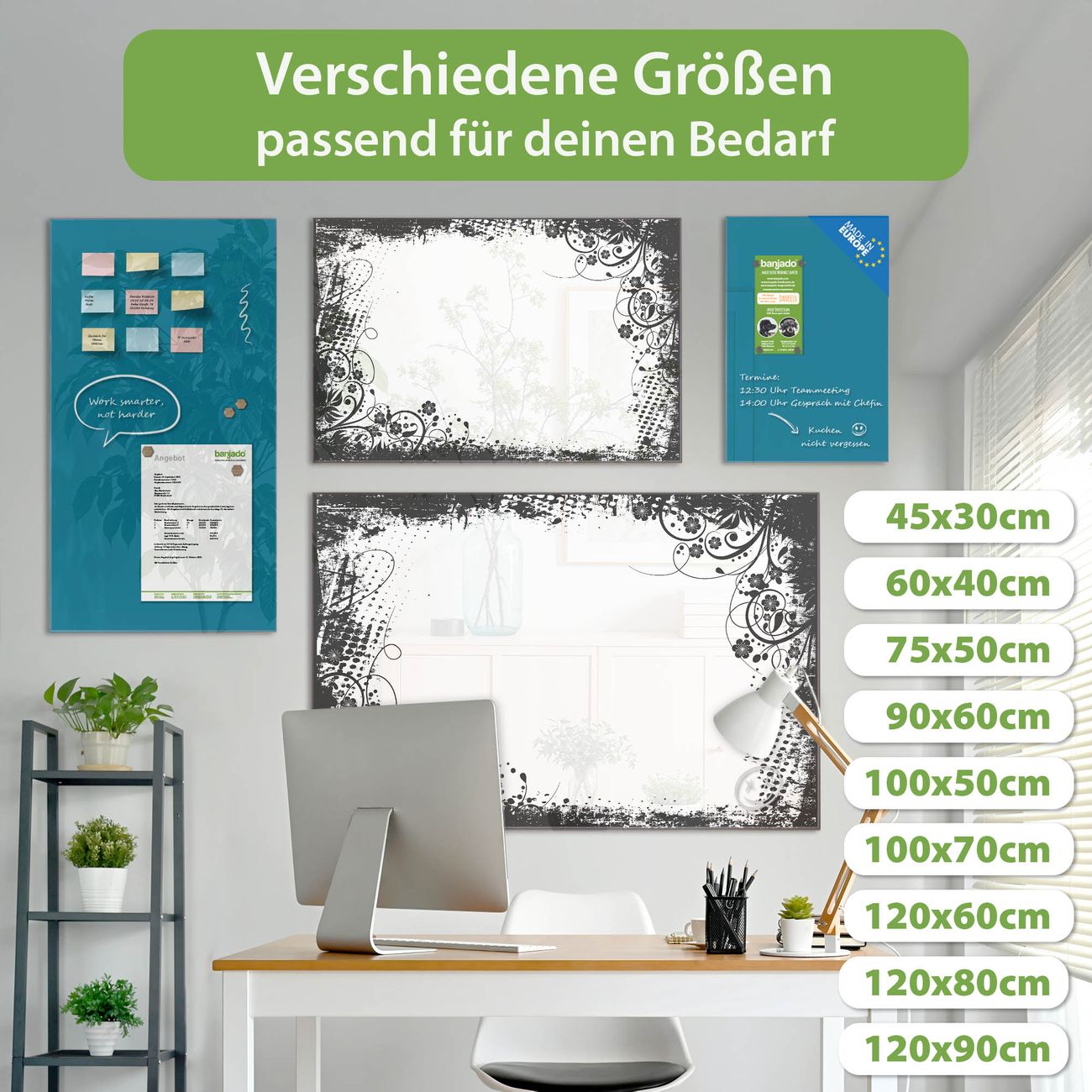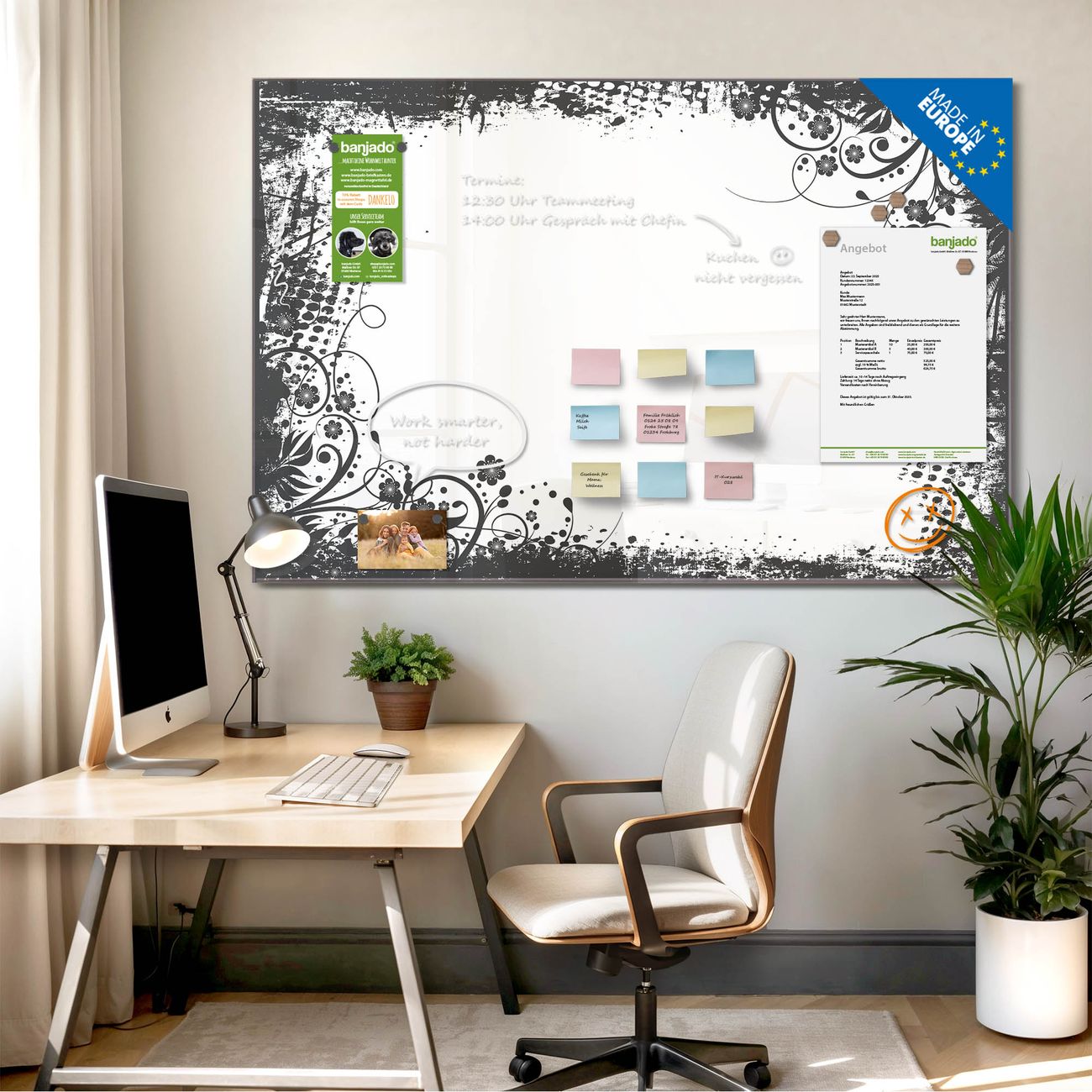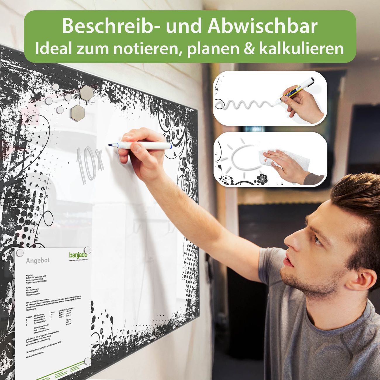 Jede Glas Magnettafel wird in unserer Werkstatt von Hand gefertigt und sorgfältig geprüft. So erhalten Sie ein echtes Qualitätsprodukt, das Funktion und Ästhetik perfekt vereint.?? Warum banjado?