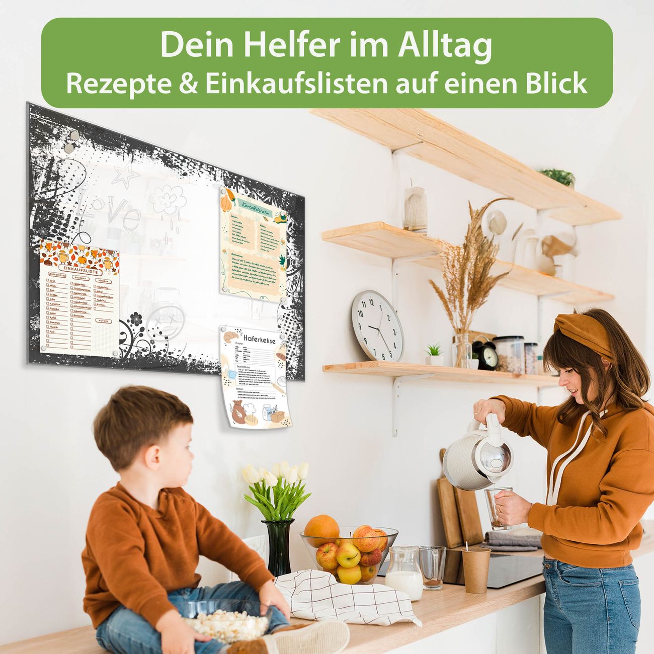 Auf der glatten Glasoberfläche lassen sich Termine, Rezepte oder Notizen ganz einfach mit Kreidestiften festhalten und rückstandslos entfernen. Starke Neodym-Magnete halten Ihre wichtigsten Erinnerungen sicher an Ort und Stelle. So entsteht Ihre ganz persönliche Ideenwand - jeden Tag neu.