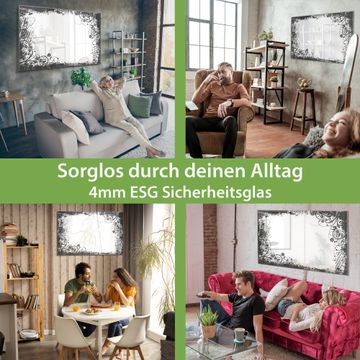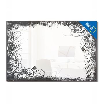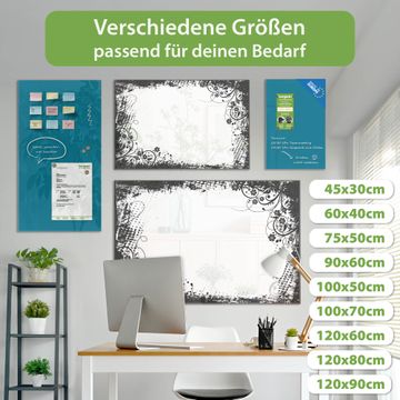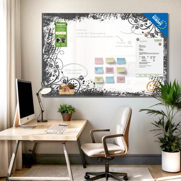 Material: 4mm Sicherheitsglas mit Metallrückwand Eigenschaften: beschreibbar, magnetisch, kratzfest Maße: 120x80x0,6cm, 14,40kg schwer Motiv Nummer 13563 Florales Schwarz-Weiß Muster Zubehör: inklusive 4 Neodym-Magnete