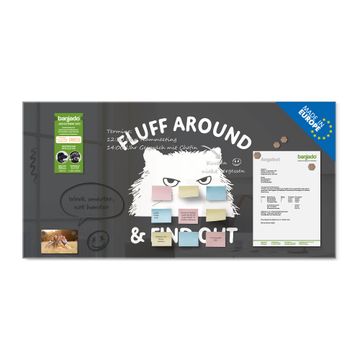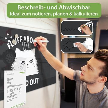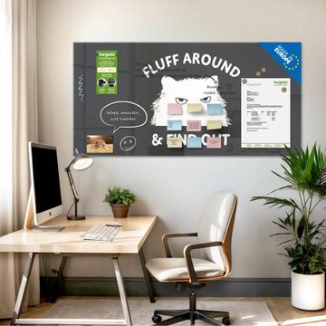Material: 4mm Sicherheitsglas mit Metallrückwand Eigenschaften: beschreibbar, magnetisch, kratzfest Maße: 100x50x0,6cm, 7,50kg schwer Motiv Nummer 13356 Fluff Around Cat Zubehör: inklusive 4 Neodym-Magnete