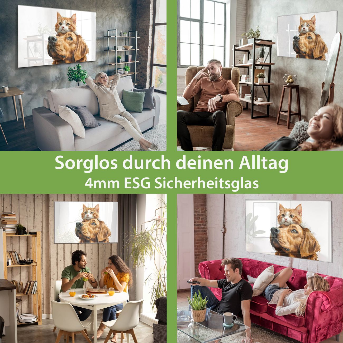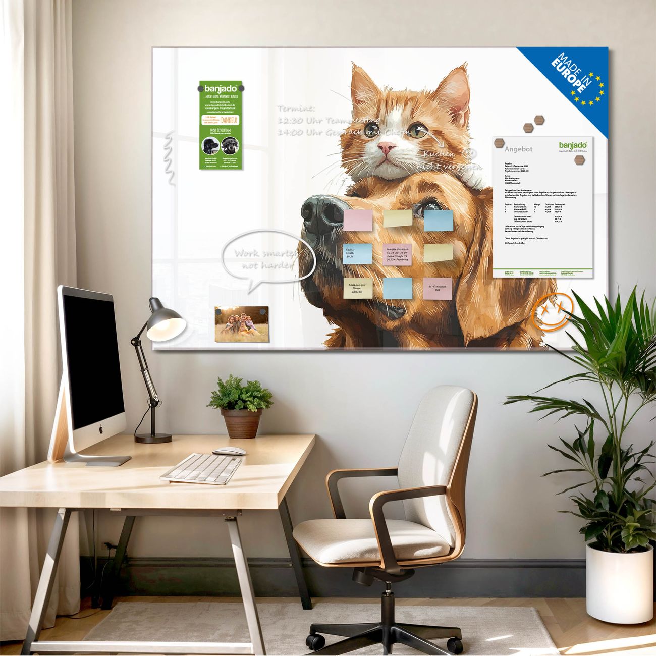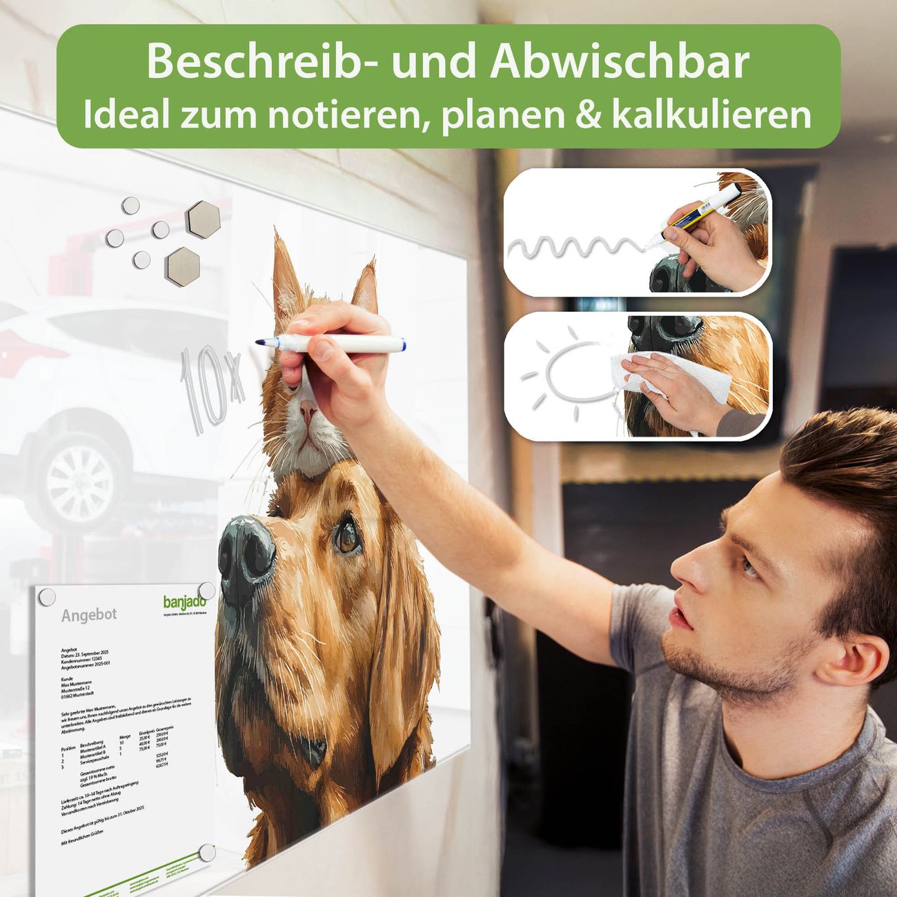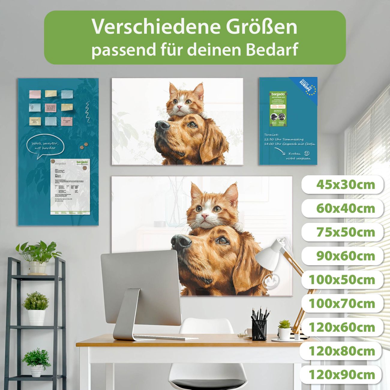 Material: 4mm Sicherheitsglas mit Metallrückwand Eigenschaften: beschreibbar, magnetisch, kratzfest Maße: 60x40x0,6cm, 3,6kg schwer Motiv Nummer 13407 Freundschaft in Fell Zubehör: inklusive 4 Neodym-Magnete