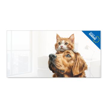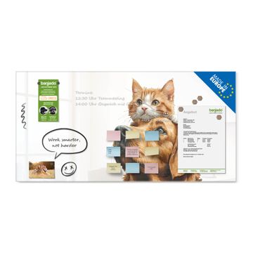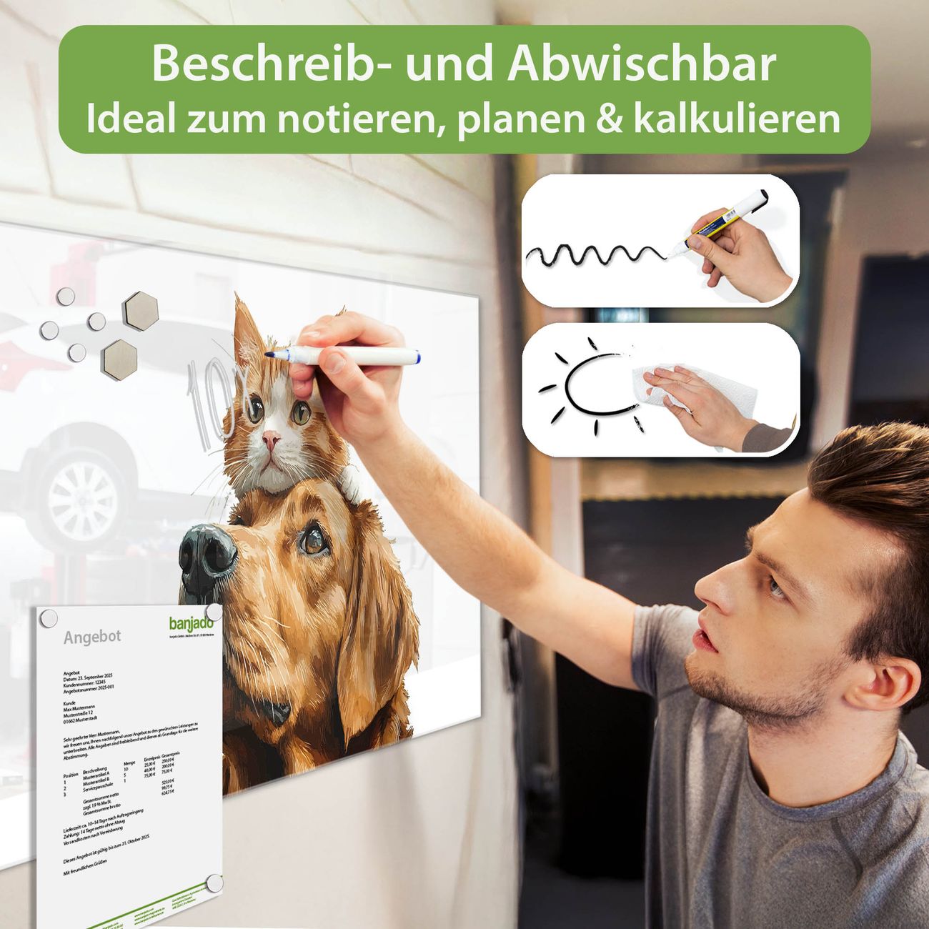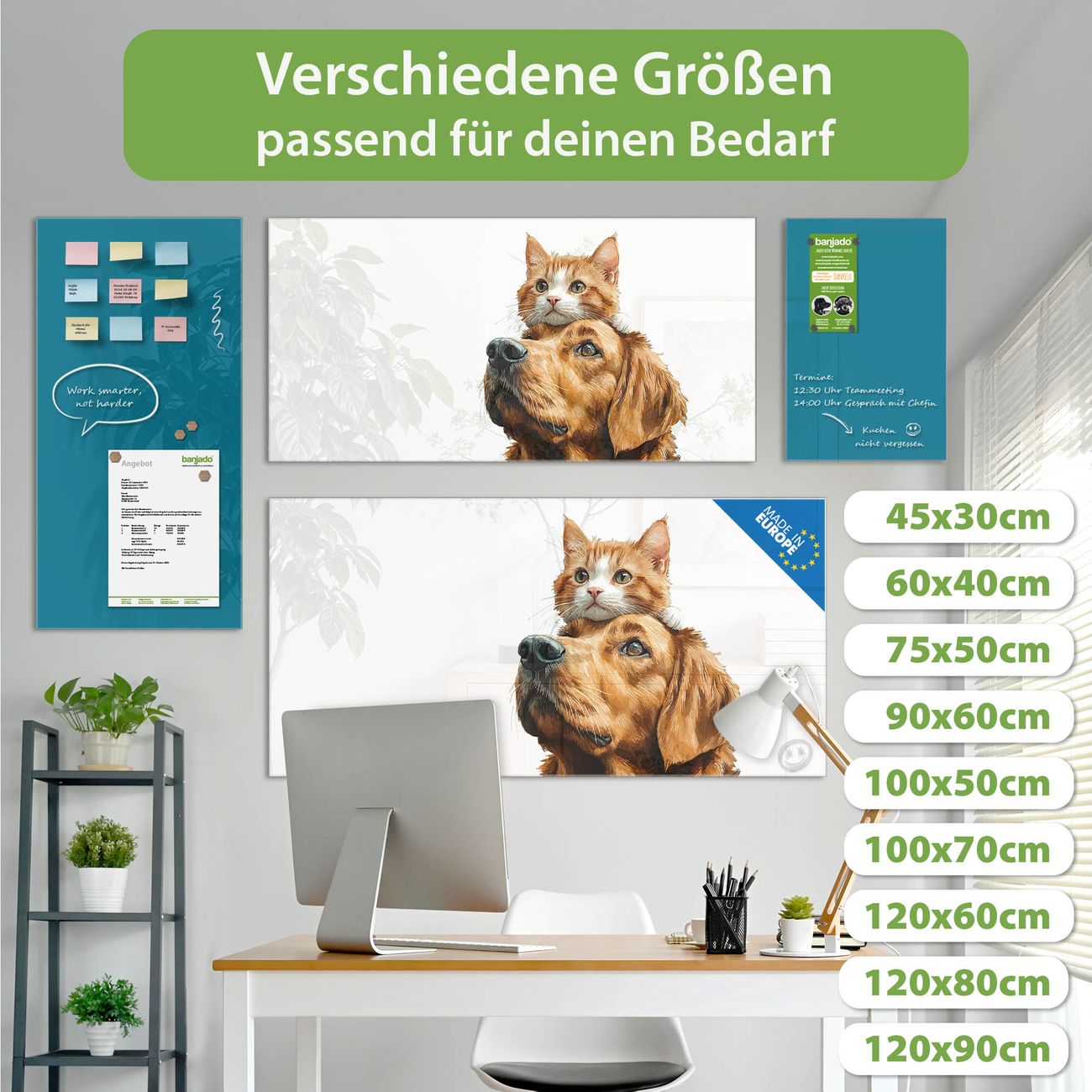 Material: 4mm Sicherheitsglas mit Metallrückwand Eigenschaften: beschreibbar, magnetisch, kratzfest Maße: 100x50x0,6cm, 7,50kg schwer Motiv Nummer 13407 Freundschaft in Fell Zubehör: inklusive 4 Neodym-Magnete