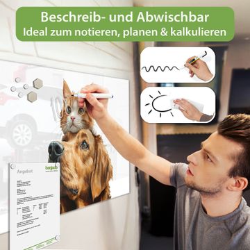 Auf der glatten Glasoberfläche lassen sich Termine, Rezepte oder Notizen ganz einfach mit Kreidestiften festhalten und rückstandslos entfernen. Starke Neodym-Magnete halten Ihre wichtigsten Erinnerungen sicher an Ort und Stelle. So entsteht Ihre ganz persönliche Ideenwand - jeden Tag neu.