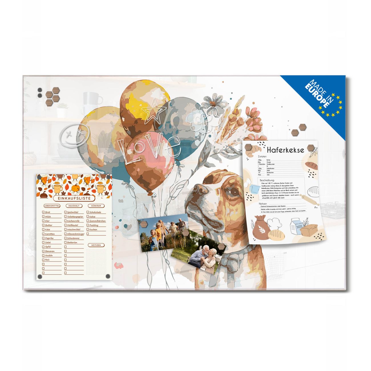 Ein Stück Design, das Ihren Alltag organisiert. Schreiben, heften, inspirieren - alles an einem Ort. Qualität, die man spürt. Montage leicht gemacht. Handwerk mit Herz - veredelt in Sachsen. Einzigartiges Design mit Motiv Motiv Fröhliche Hundeparade Beschreibbare Glasoberfläche, leicht zu reinigen Starke Magnetkraft durch Stahlrückwand Inklusive 4 Neodym-Magneten Flexible Montageoptionen Handveredelt in Sachsen - Qualität, die bleibt