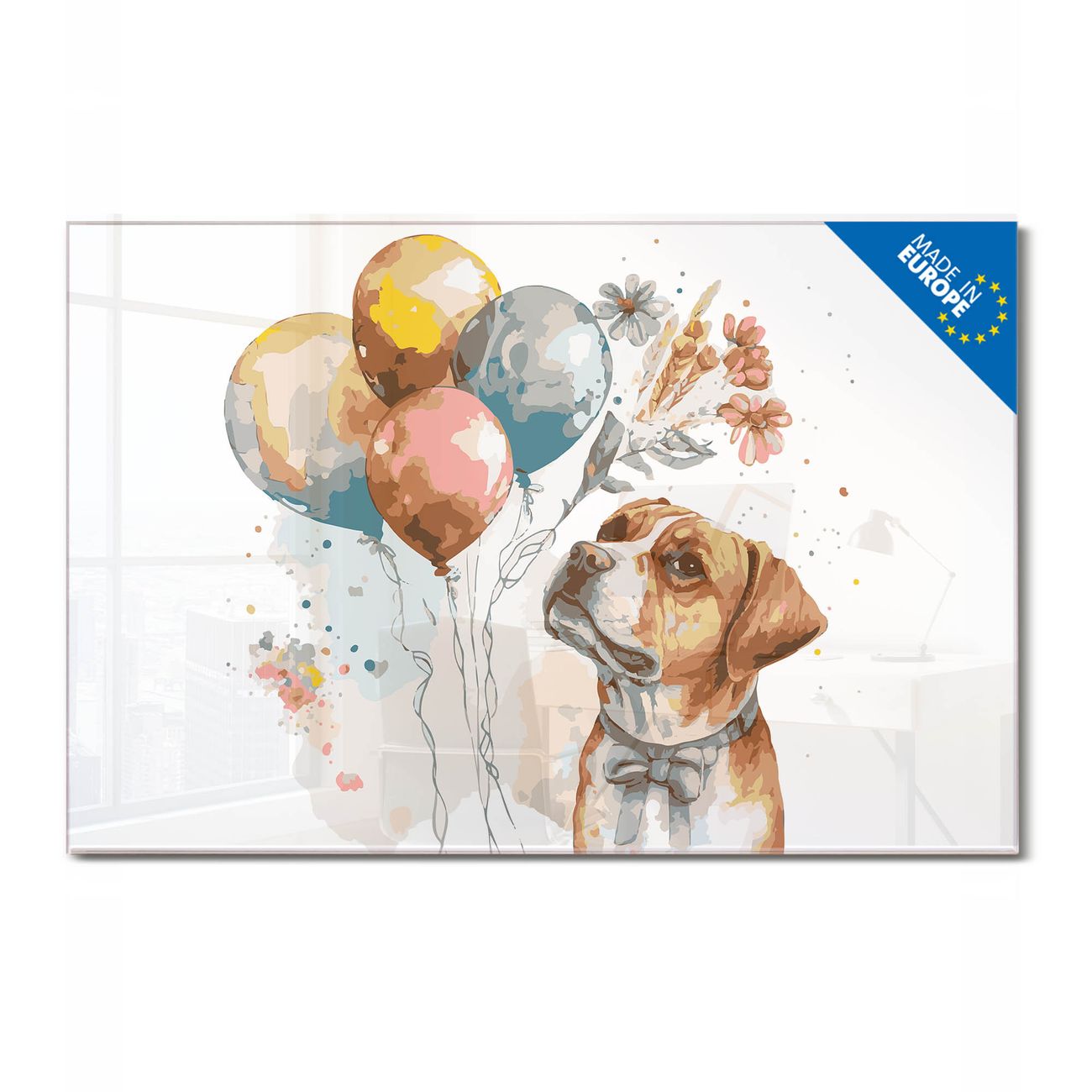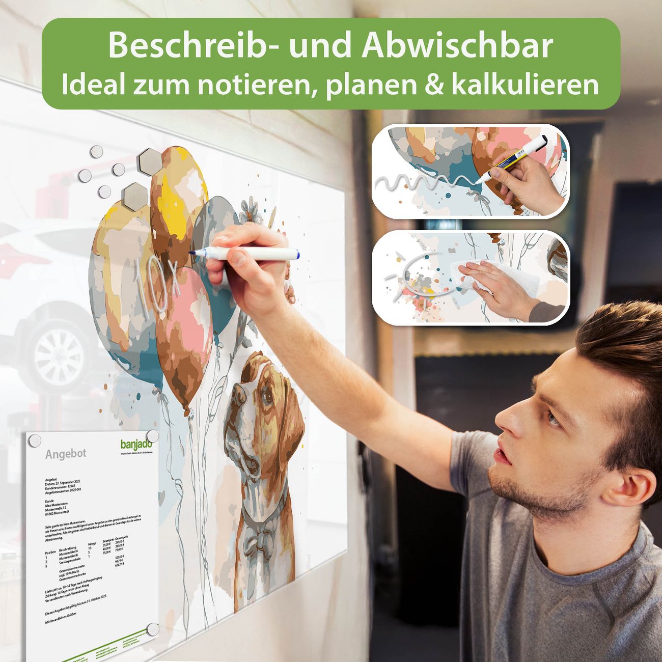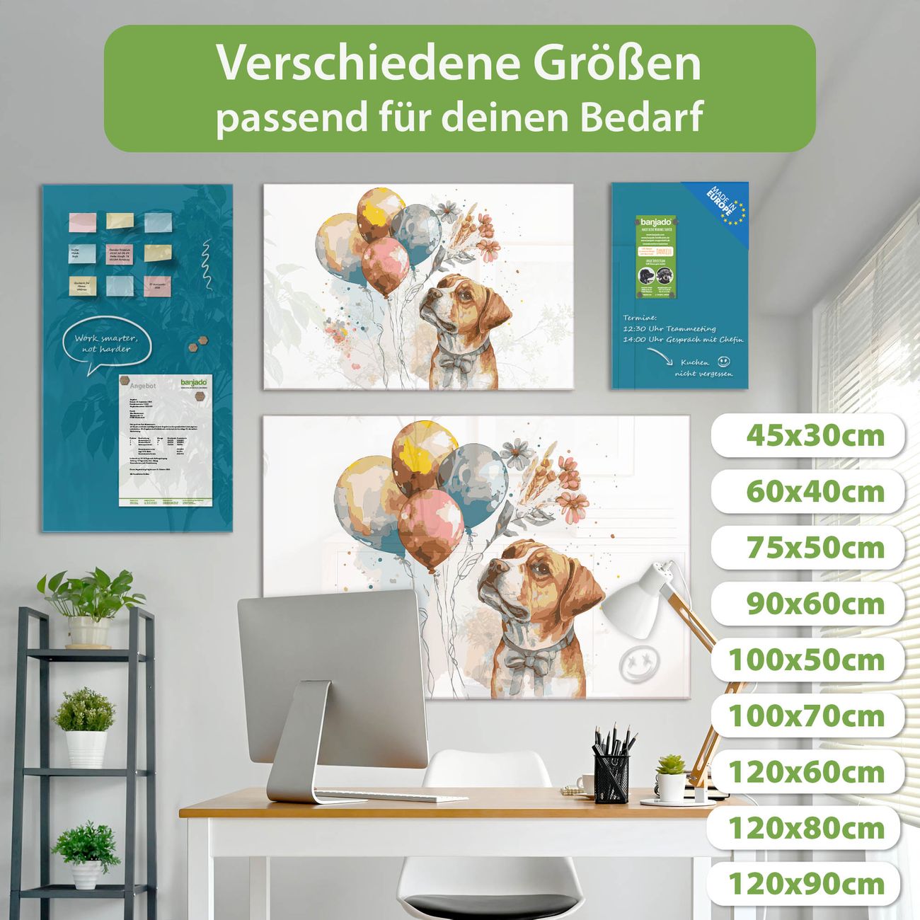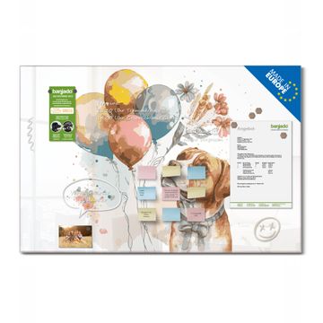 Material: 4mm Sicherheitsglas mit Metallrückwand Eigenschaften: beschreibbar, magnetisch, kratzfest Maße: 90x60x0,6cm, 8,10kg schwer Motiv Nummer 13416 Fröhliche Hundeparade Zubehör: inklusive 4 Neodym-Magnete