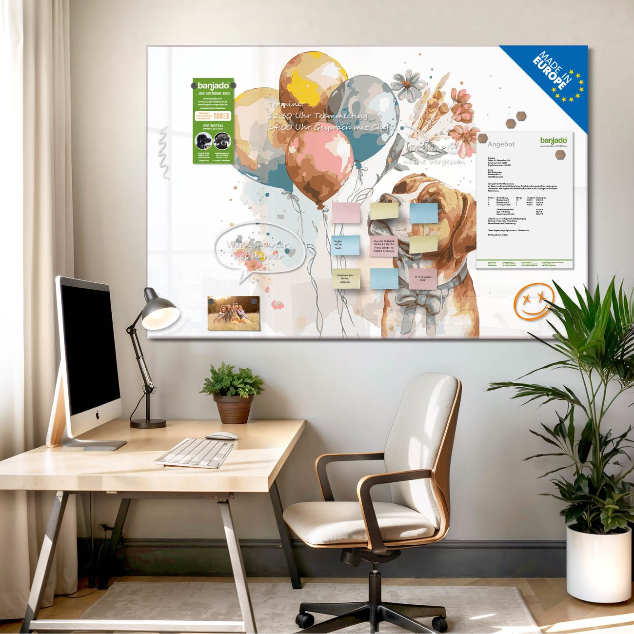 Die banjado Glas Magnettafel mit dem Motiv Motiv Fröhliche Hundeparade verbindet Funktionalität mit Stil. Sie ersetzt das Zettelchaos durch klare Strukturen und bringt dabei eine warme, natürliche Atmosphäre in Ihr Zuhause. Ob im Büro, in der Küche oder im Eingangsbereich - dieses Design-Board zieht Blicke an und sorgt für Ordnung mit Charakter.