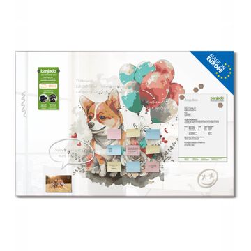 Material: 4mm Sicherheitsglas mit Metallrückwand Eigenschaften: beschreibbar, magnetisch, kratzfest Maße: 120x80x0,6cm, 14,40kg schwer Motiv Nummer 13414 Fröhlicher Corgi mit Ballons Zubehör: inklusive 4 Neodym-Magnete