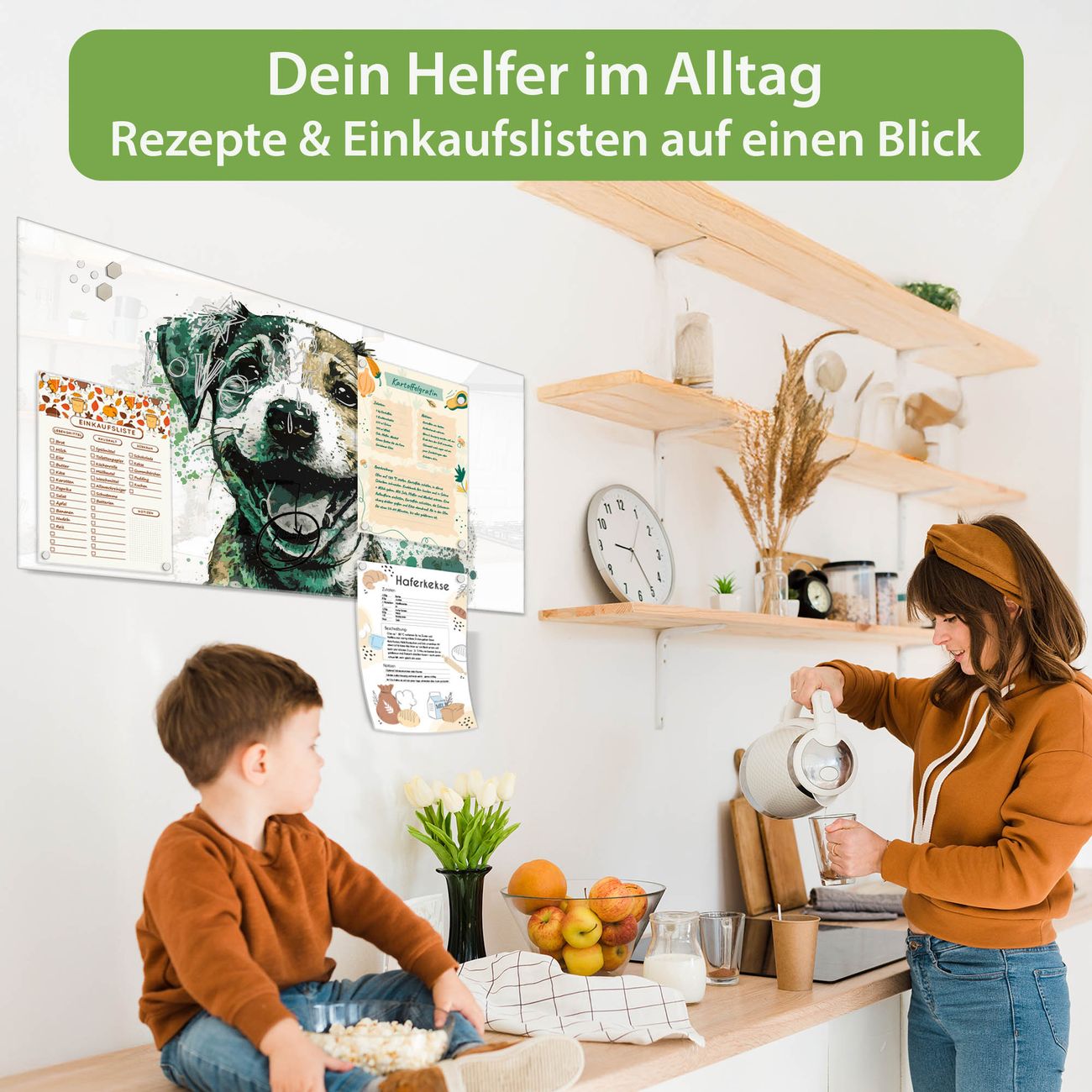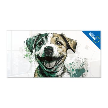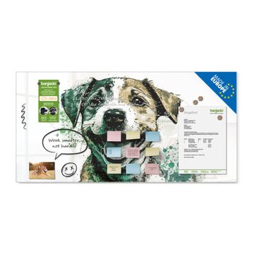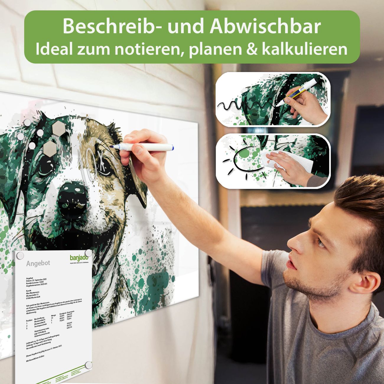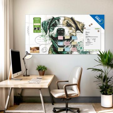 Material: 4mm Sicherheitsglas mit Metallrückwand Eigenschaften: beschreibbar, magnetisch, kratzfest Maße: 100x50x0,6cm, 7,50kg schwer Motiv Nummer 13423 Fröhlicher Welpe Zubehör: inklusive 4 Neodym-Magnete