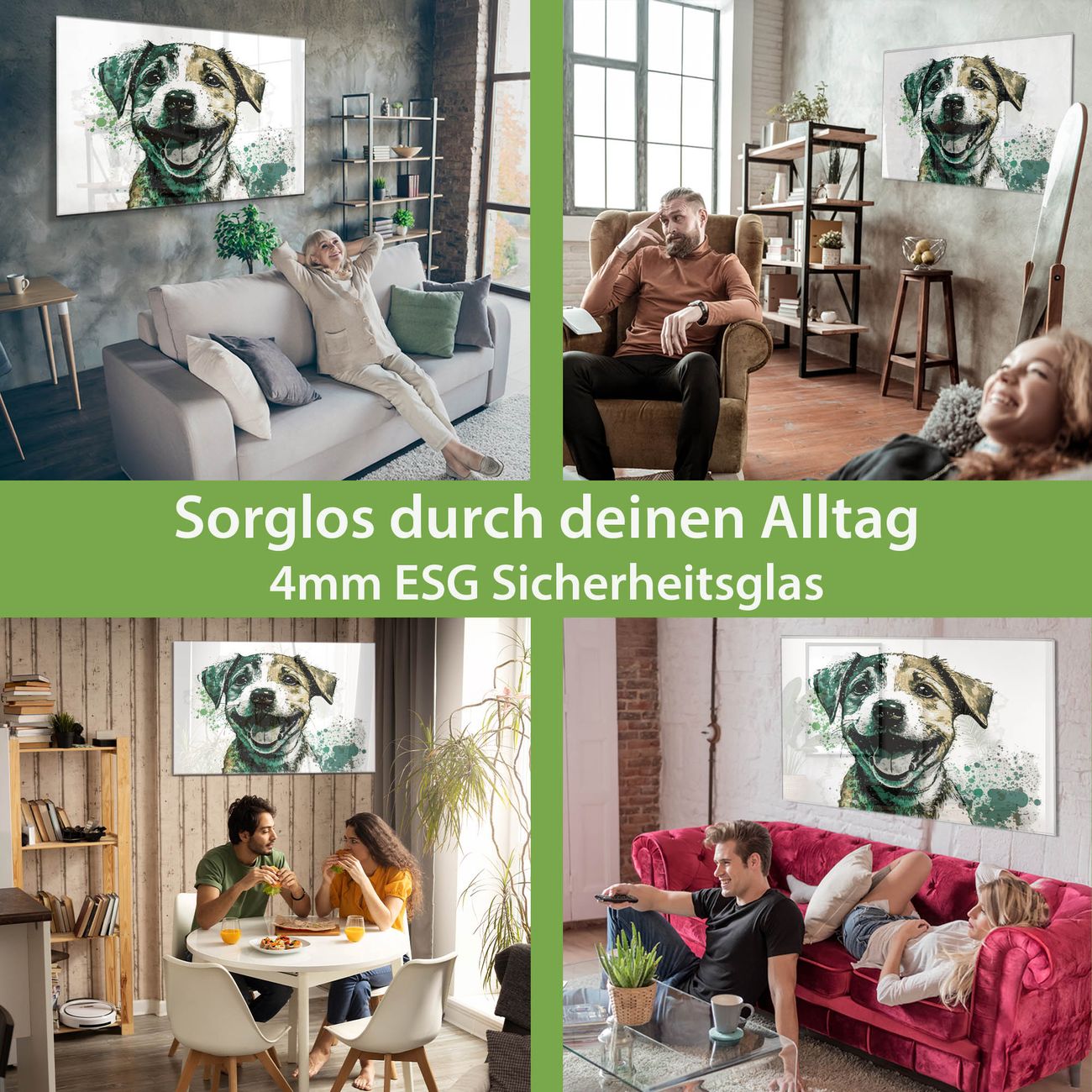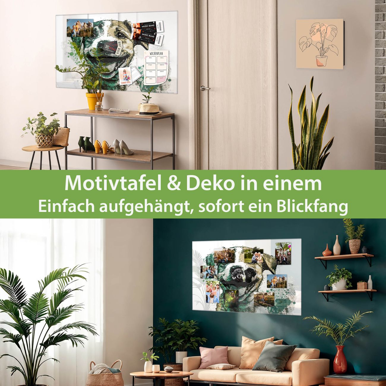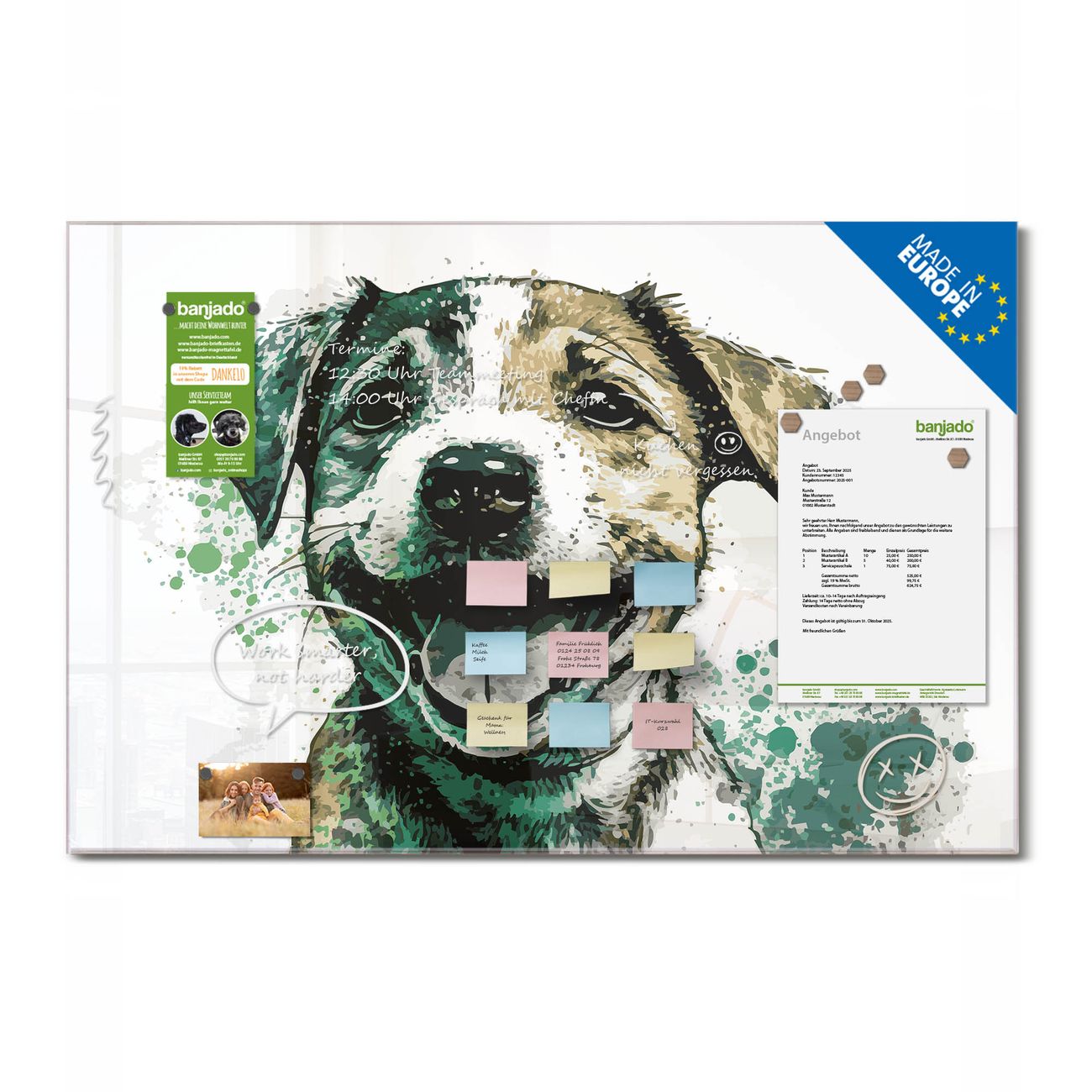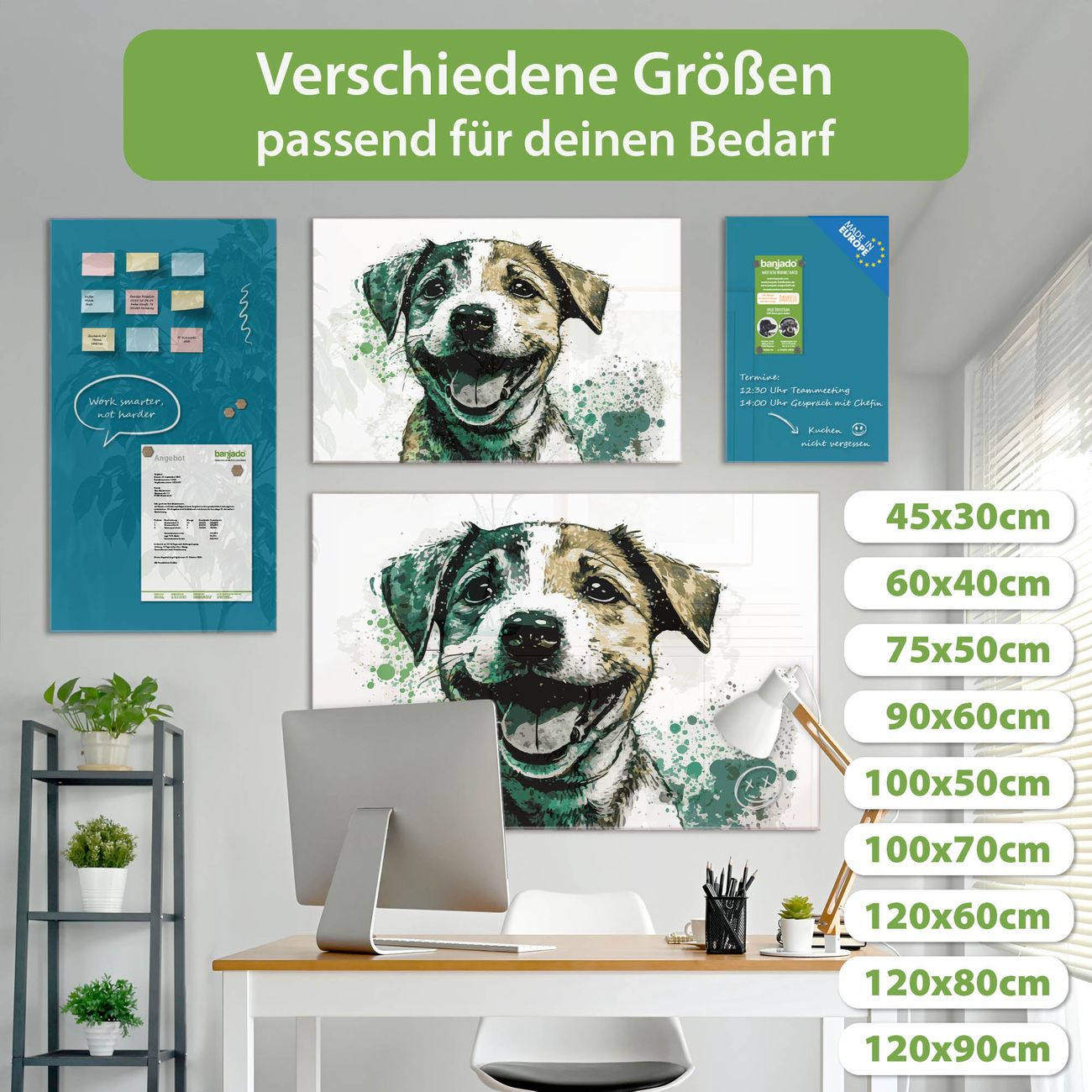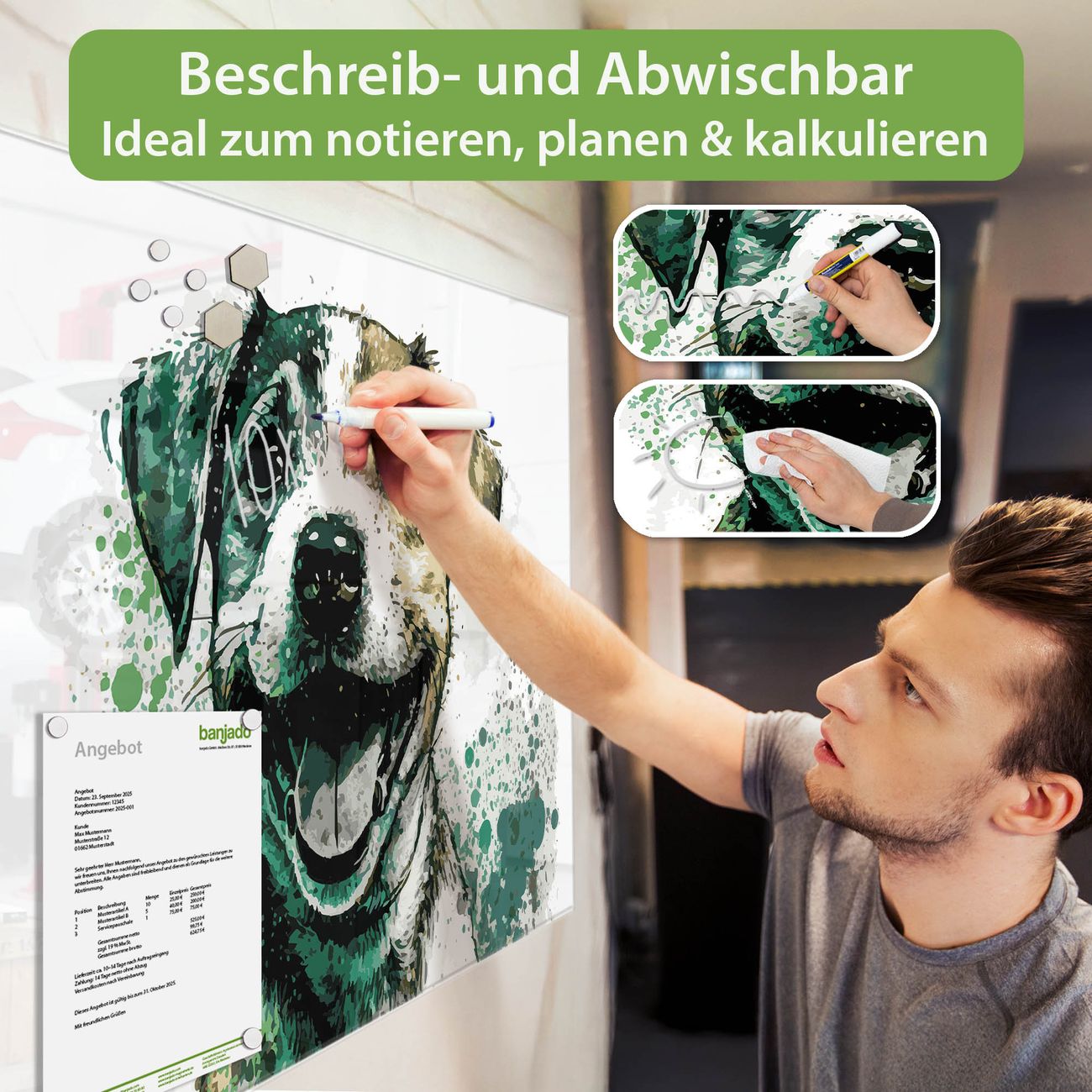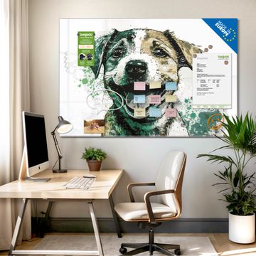 Material: 4mm Sicherheitsglas mit Metallrückwand Eigenschaften: beschreibbar, magnetisch, kratzfest Maße: 120x80x0,6cm, 14,40kg schwer Motiv Nummer 13423 Fröhlicher Welpe Zubehör: inklusive 4 Neodym-Magnete