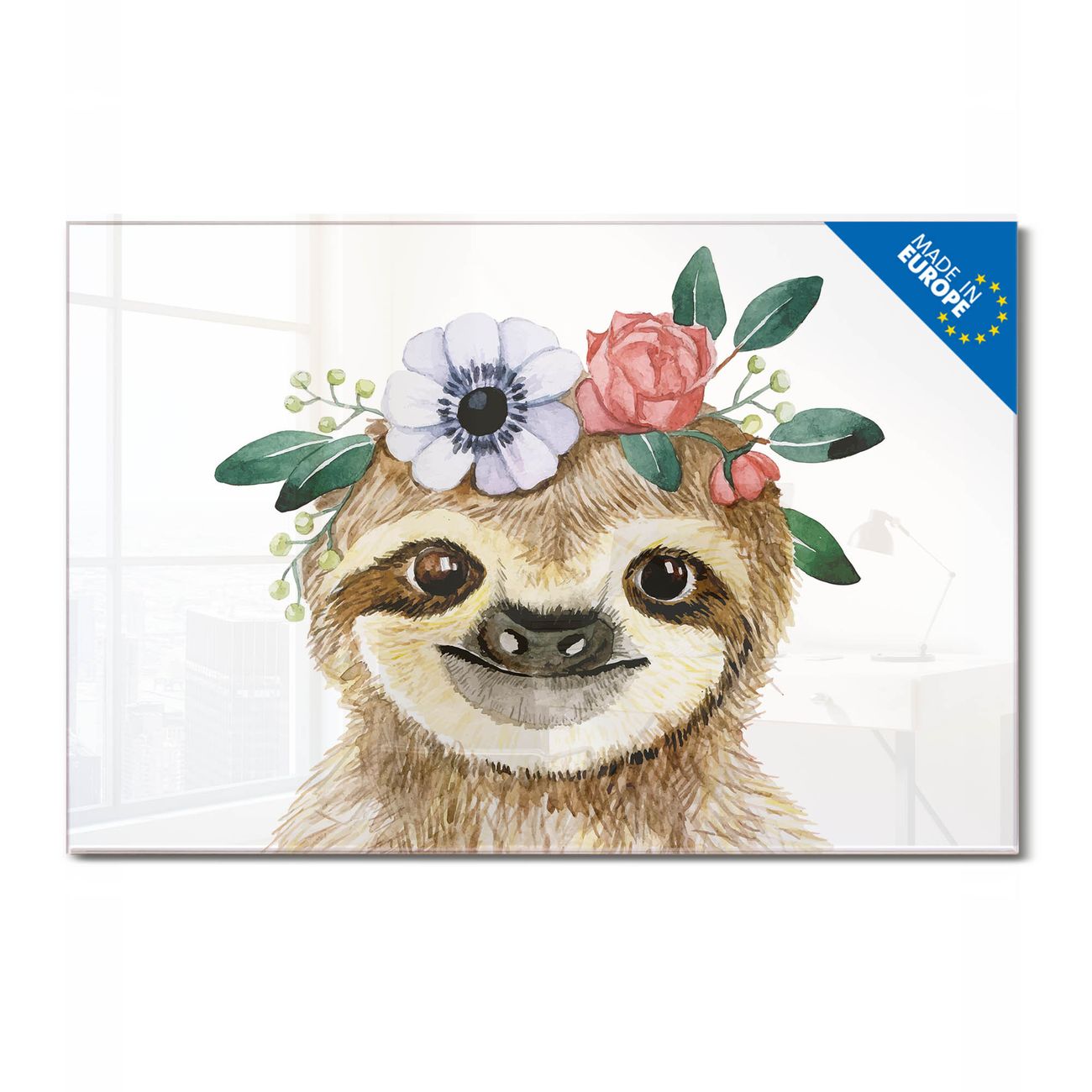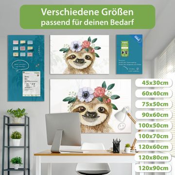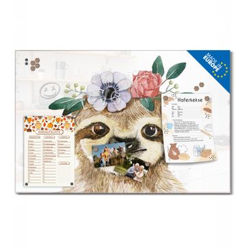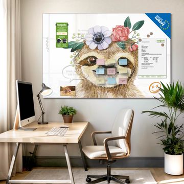 Material: 4mm Sicherheitsglas mit Metallrückwand Eigenschaften: beschreibbar, magnetisch, kratzfest Maße: 75x50x0,6cm, 5,63kg schwer Motiv Nummer 13456 Fröhliches Faultier mit Blumenkranz Zubehör: inklusive 4 Neodym-Magnete