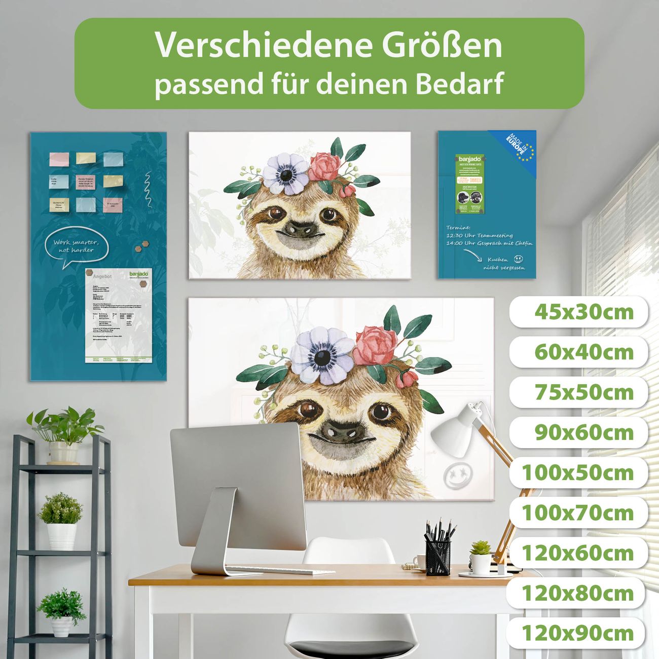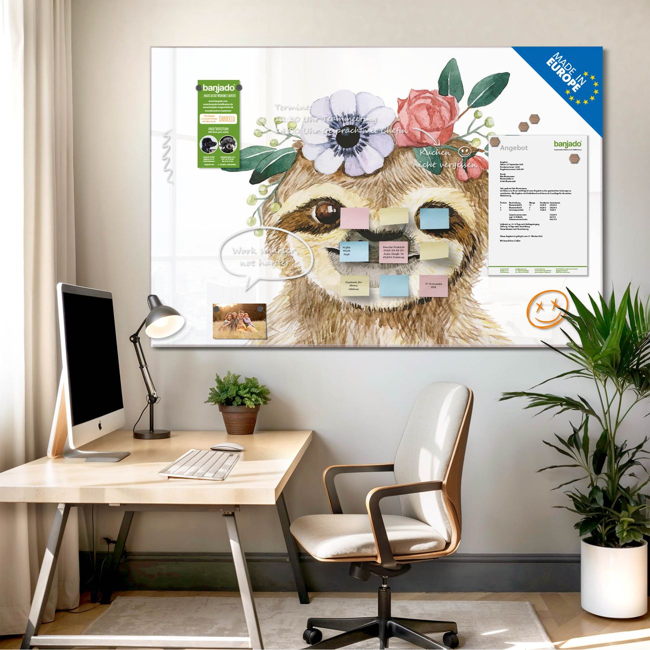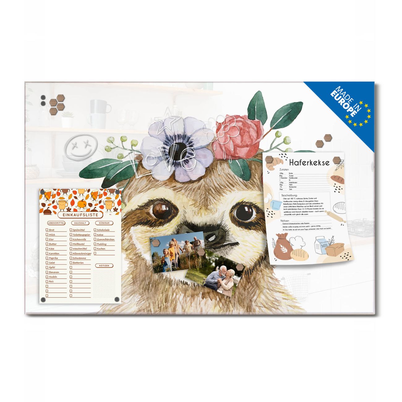 Ein Stück Design, das Ihren Alltag organisiert. Schreiben, heften, inspirieren - alles an einem Ort. Qualität, die man spürt. Montage leicht gemacht. Handwerk mit Herz - veredelt in Sachsen. Einzigartiges Design mit Motiv Motiv Fröhliches Faultier mit Blumenkranz Beschreibbare Glasoberfläche, leicht zu reinigen Starke Magnetkraft durch Stahlrückwand Inklusive 4 Neodym-Magneten Flexible Montageoptionen Handveredelt in Sachsen - Qualität, die bleibt