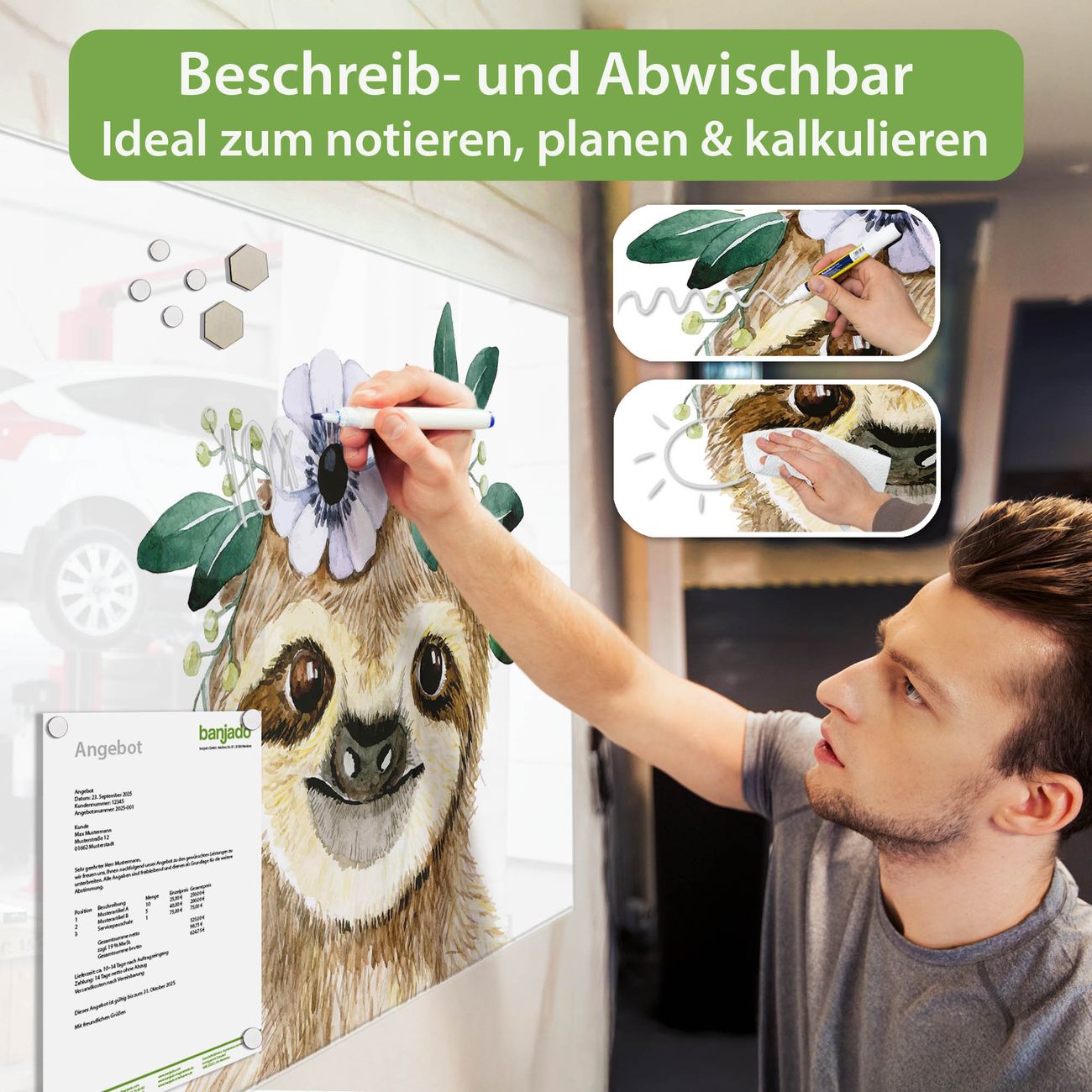 Jede Glas Magnettafel wird in unserer Werkstatt von Hand gefertigt und sorgfältig geprüft. So erhalten Sie ein echtes Qualitätsprodukt, das Funktion und Ästhetik perfekt vereint.?? Warum banjado?