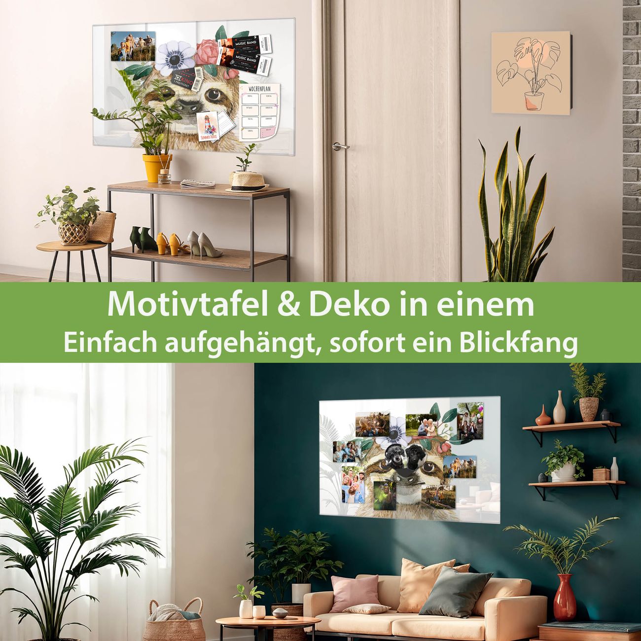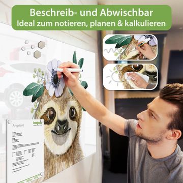 Die banjado Glas Magnettafel mit dem Motiv Motiv Fröhliches Faultier mit Blumenkranz verbindet Funktionalität mit Stil. Sie ersetzt das Zettelchaos durch klare Strukturen und bringt dabei eine warme, natürliche Atmosphäre in Ihr Zuhause. Ob im Büro, in der Küche oder im Eingangsbereich - dieses Design-Board zieht Blicke an und sorgt für Ordnung mit Charakter.