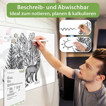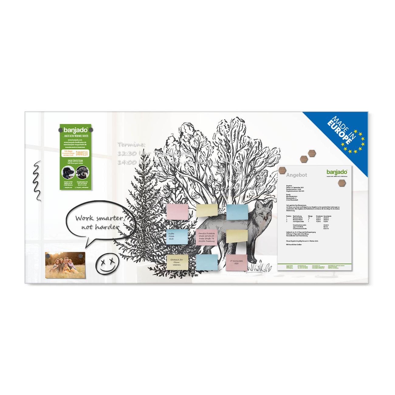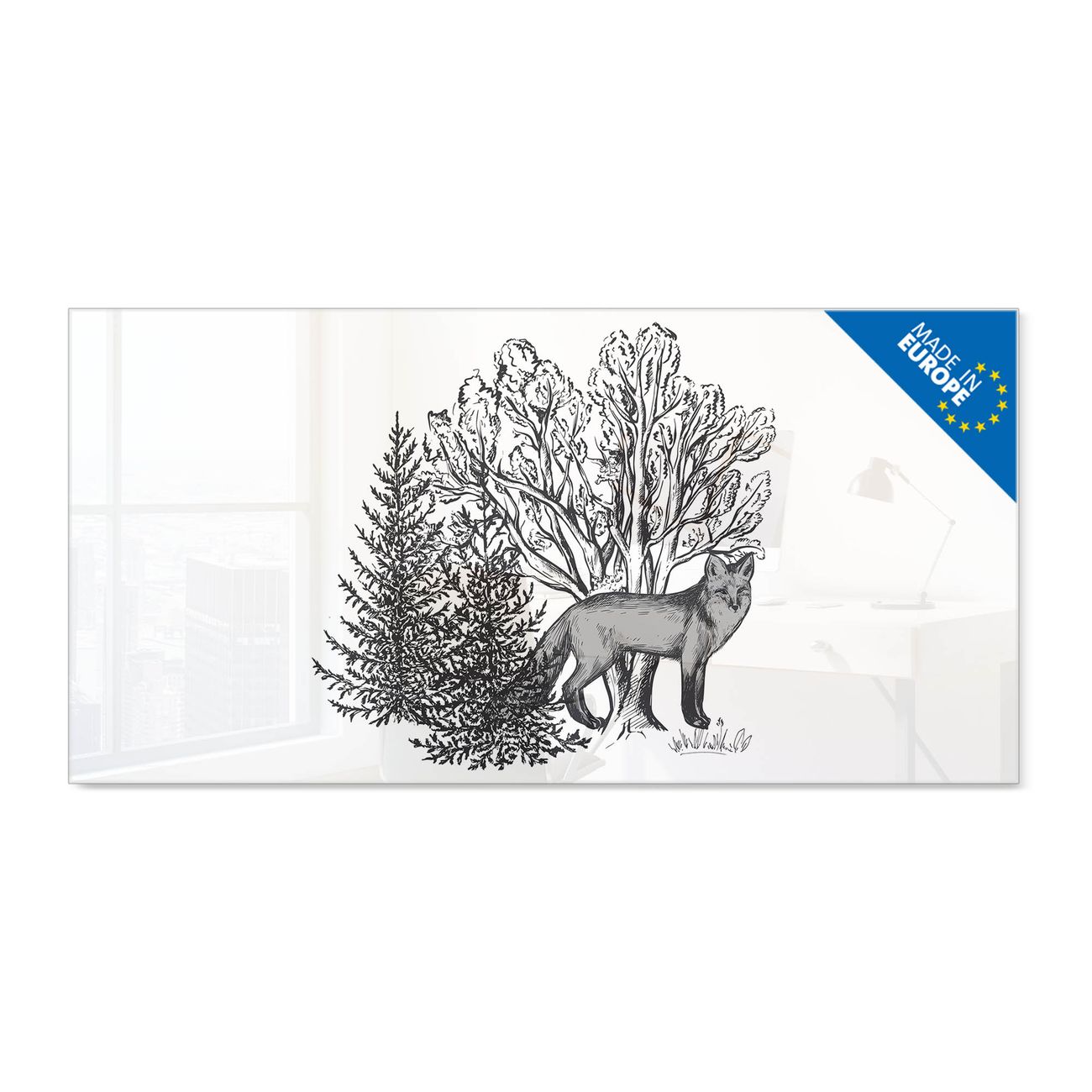 Material: 4mm Sicherheitsglas mit Metallrückwand Eigenschaften: beschreibbar, magnetisch, kratzfest Maße: 100x50x0,6cm, 7,50kg schwer Motiv Nummer 13483 Fuchs im Wald Zubehör: inklusive 4 Neodym-Magnete