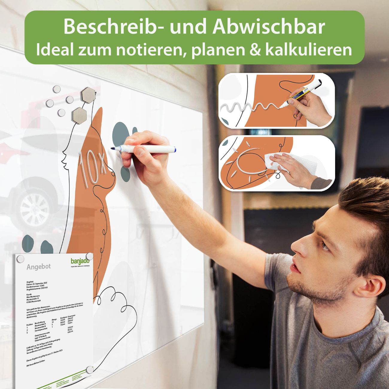 Jede Glas Magnettafel wird in unserer Werkstatt von Hand gefertigt und sorgfältig geprüft. So erhalten Sie ein echtes Qualitätsprodukt, das Funktion und Ästhetik perfekt vereint.?? Warum banjado?