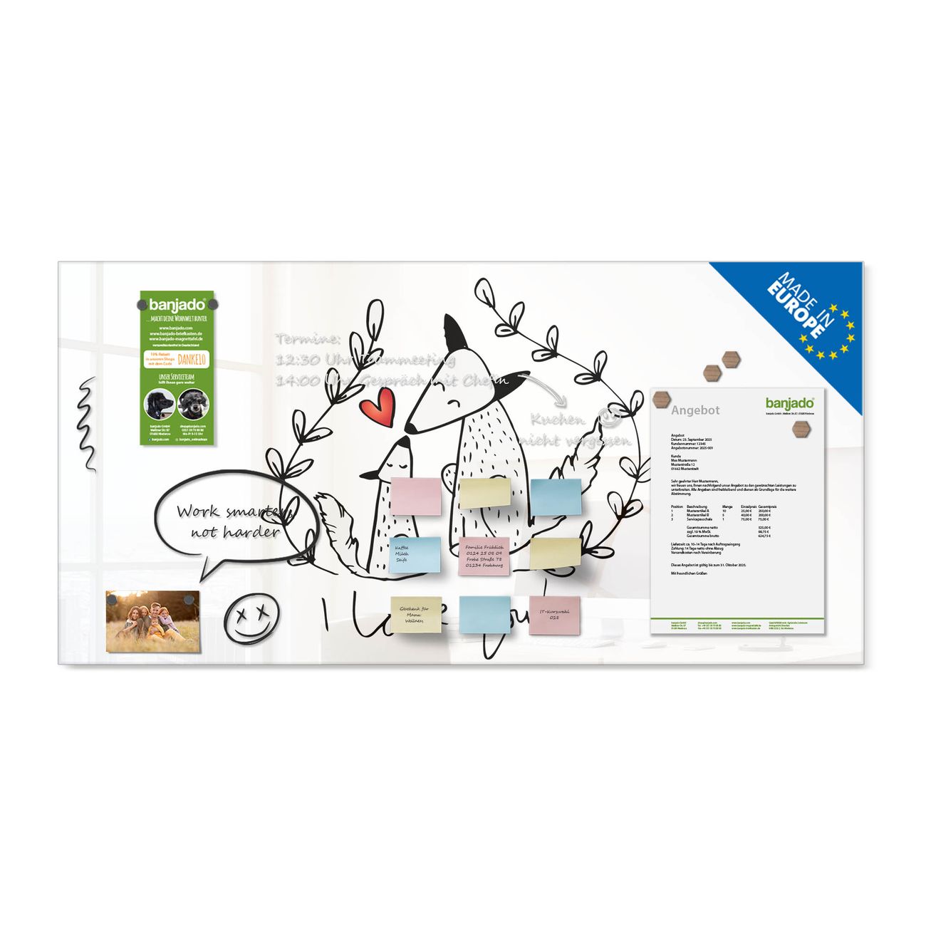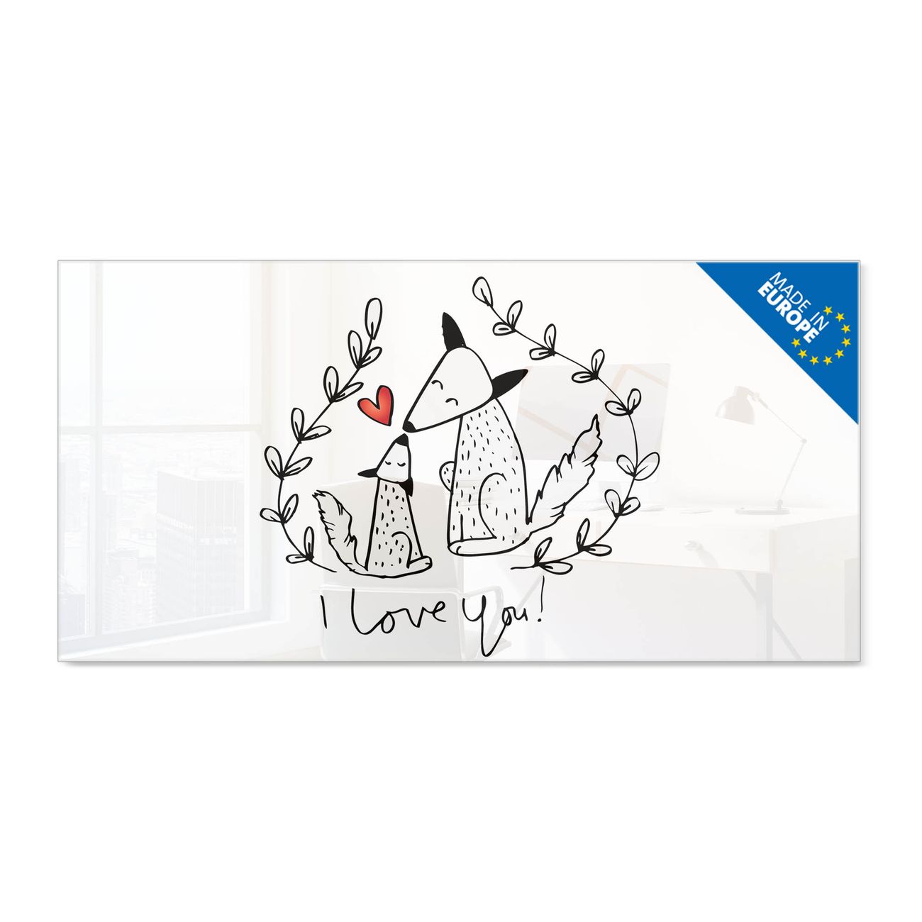 Material: 4mm Sicherheitsglas mit Metallrückwand Eigenschaften: beschreibbar, magnetisch, kratzfest Maße: 100x50x0,6cm, 7,50kg schwer Motiv Nummer 13313 Fuchsliebe Zubehör: inklusive 4 Neodym-Magnete