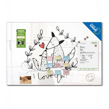 Material: 4mm Sicherheitsglas mit Metallrückwand Eigenschaften: beschreibbar, magnetisch, kratzfest Maße: 120x80x0,6cm, 14,40kg schwer Motiv Nummer 13313 Fuchsliebe Zubehör: inklusive 4 Neodym-Magnete