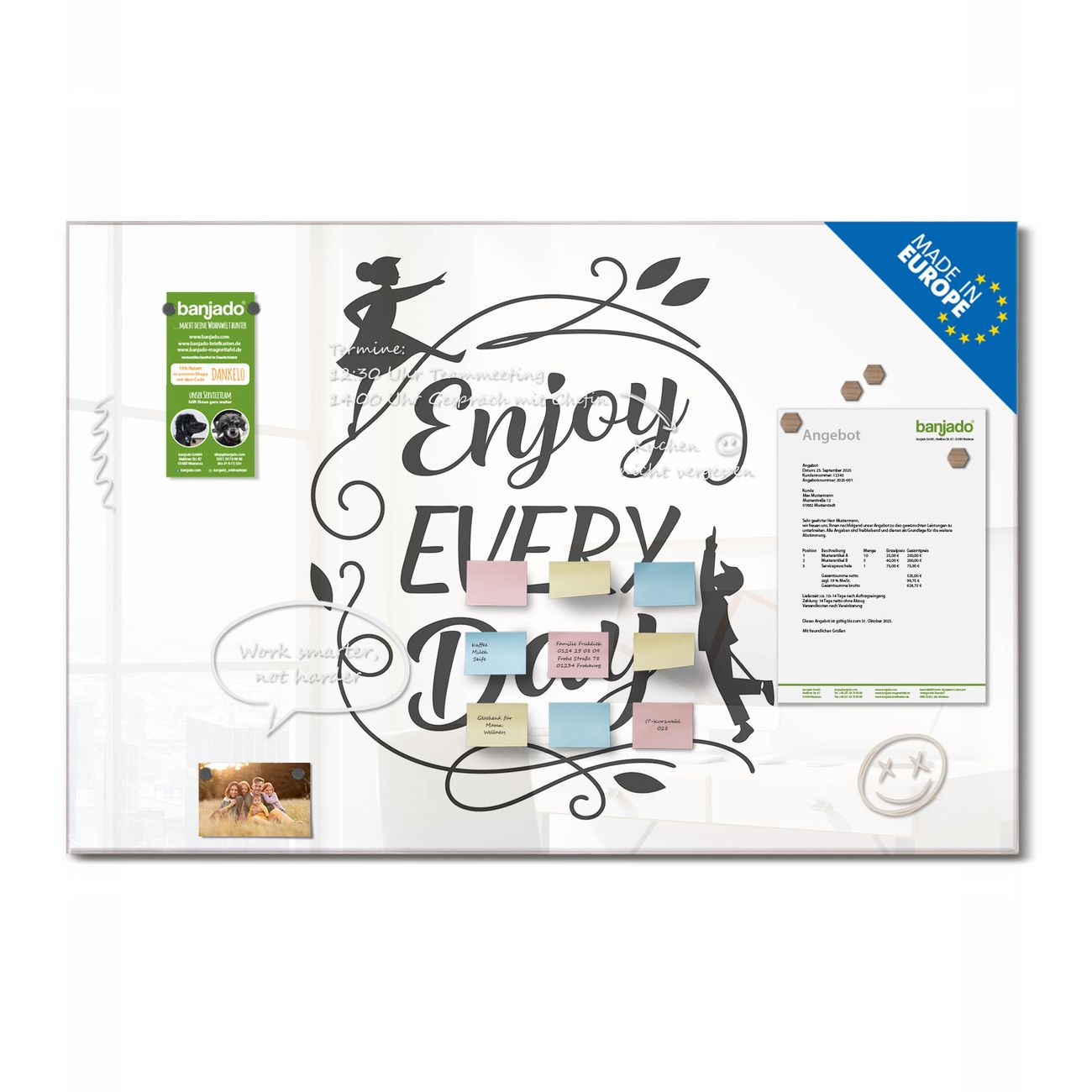 Material: 4mm Sicherheitsglas mit Metallrückwand Eigenschaften: beschreibbar, magnetisch, kratzfest Maße: 120x80x0,6cm, 14,40kg schwer Motiv Nummer 13355 Genieße Jeden Tag Zubehör: inklusive 4 Neodym-Magnete