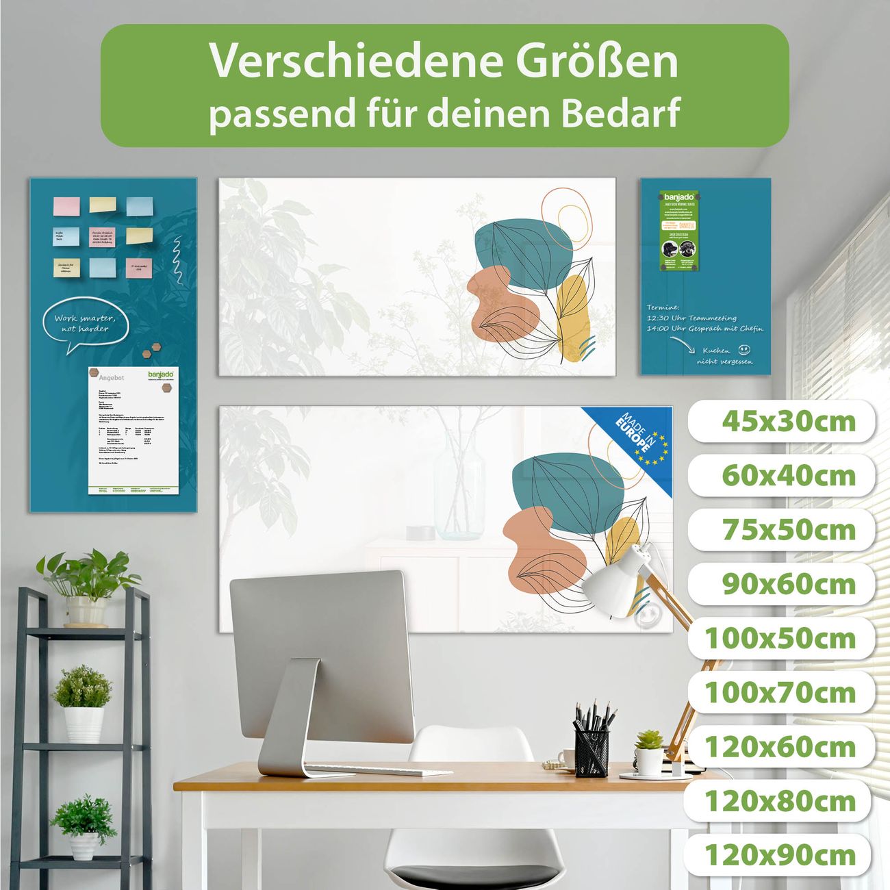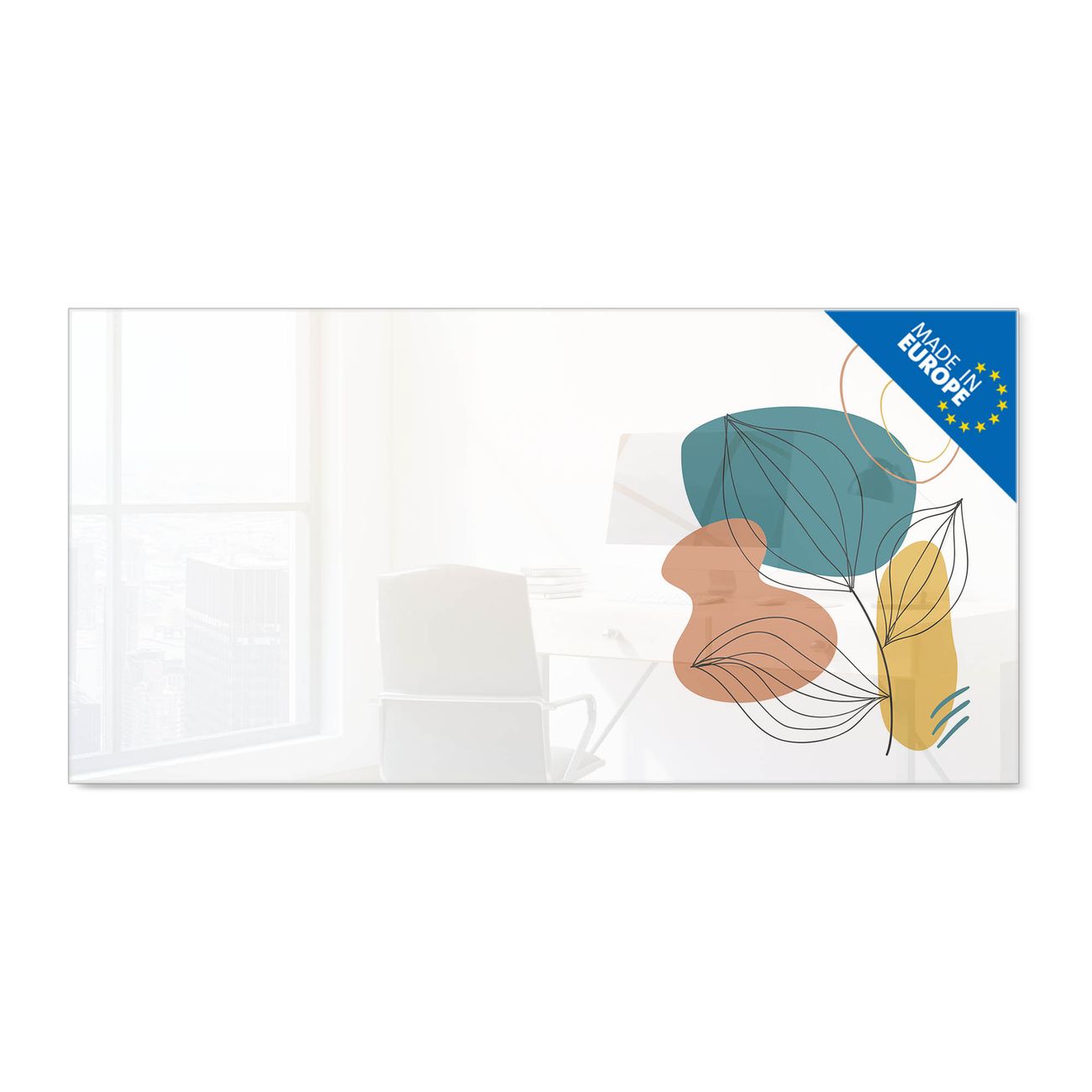 Material: 4mm Sicherheitsglas mit Metallrückwand Eigenschaften: beschreibbar, magnetisch, kratzfest Maße: 100x50x0,6cm, 7,50kg schwer Motiv Nummer 13299 Geometrische Blätter Zubehör: inklusive 4 Neodym-Magnete
