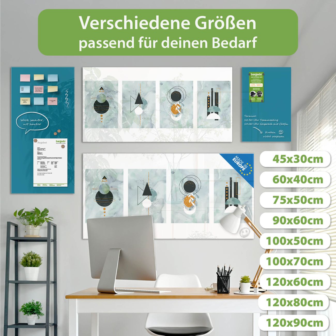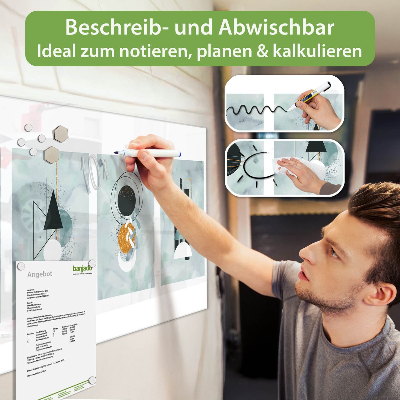 Material: 4mm Sicherheitsglas mit Metallrückwand Eigenschaften: beschreibbar, magnetisch, kratzfest Maße: 100x50x0,6cm, 7,50kg schwer Motiv Nummer 13139 Geometrische Komposition Zubehör: inklusive 4 Neodym-Magnete