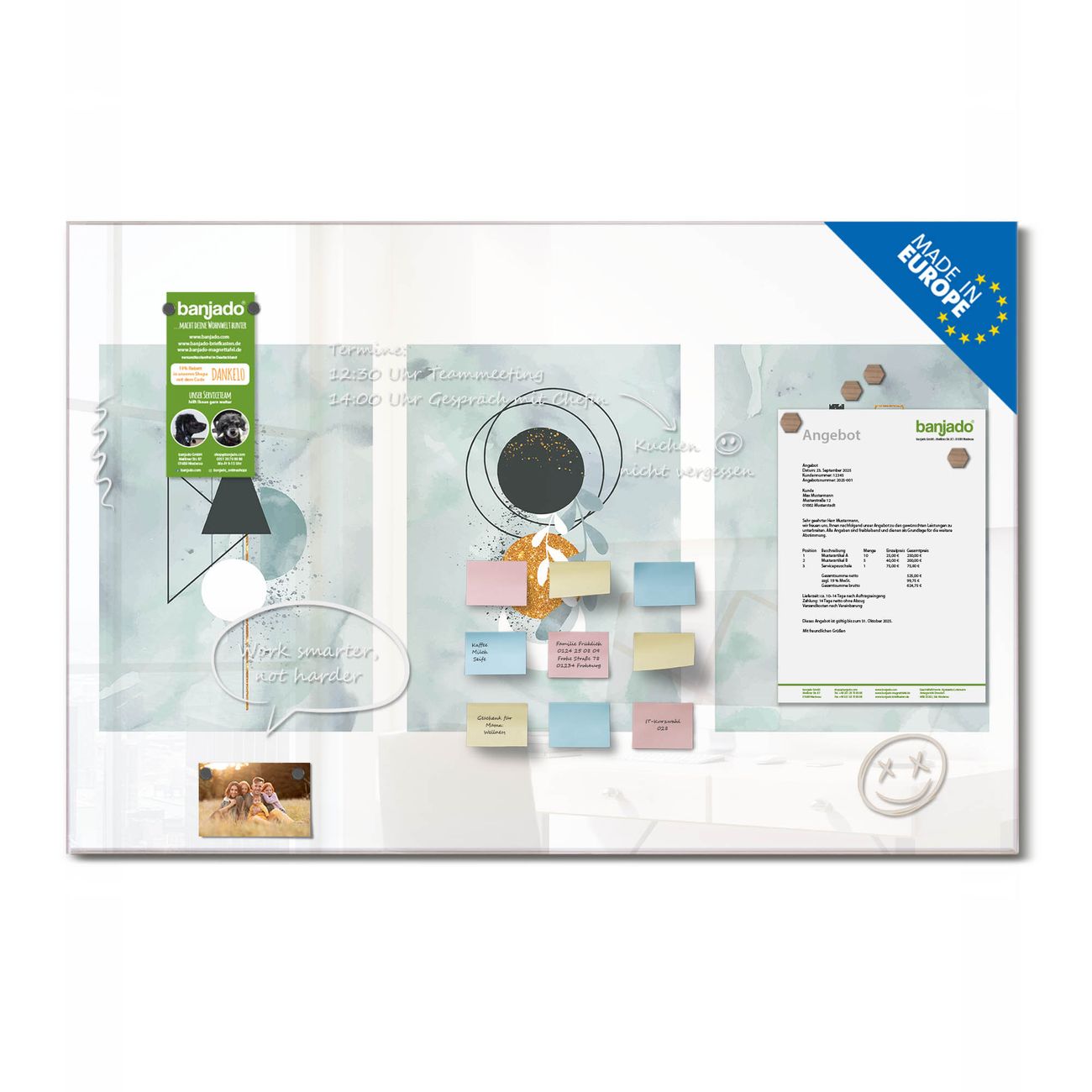 Jede Glas Magnettafel wird in unserer Werkstatt von Hand gefertigt und sorgfältig geprüft. So erhalten Sie ein echtes Qualitätsprodukt, das Funktion und Ästhetik perfekt vereint.?? Warum banjado?