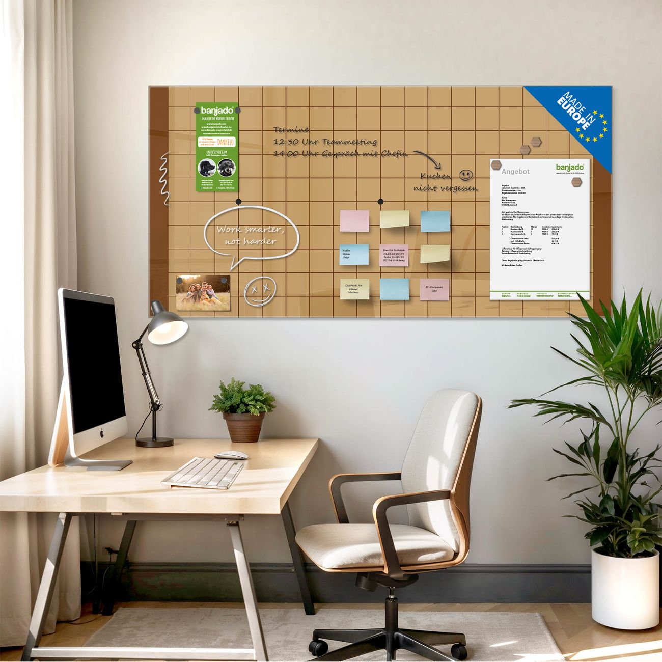 Jede Glas Magnettafel wird in unserer Werkstatt von Hand gefertigt und sorgfältig geprüft. So erhalten Sie ein echtes Qualitätsprodukt, das Funktion und Ästhetik perfekt vereint.?? Warum banjado?