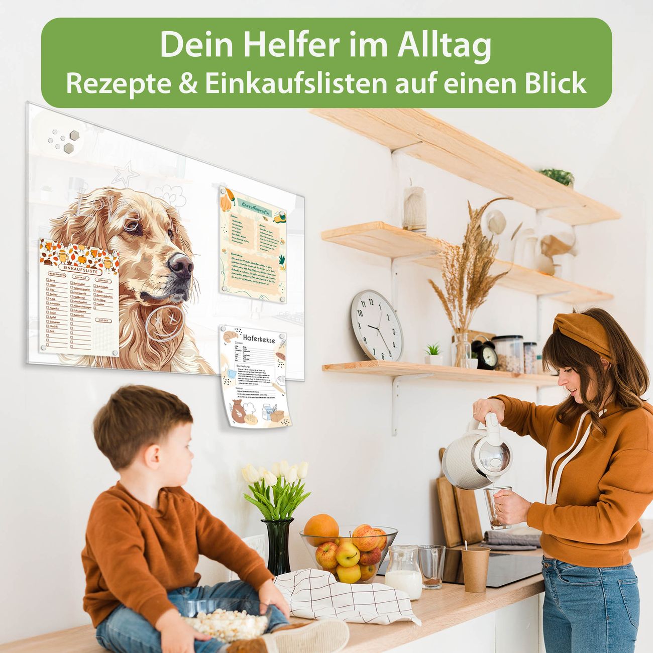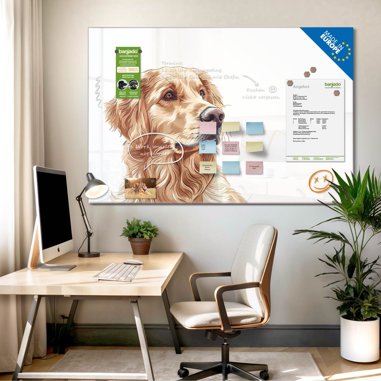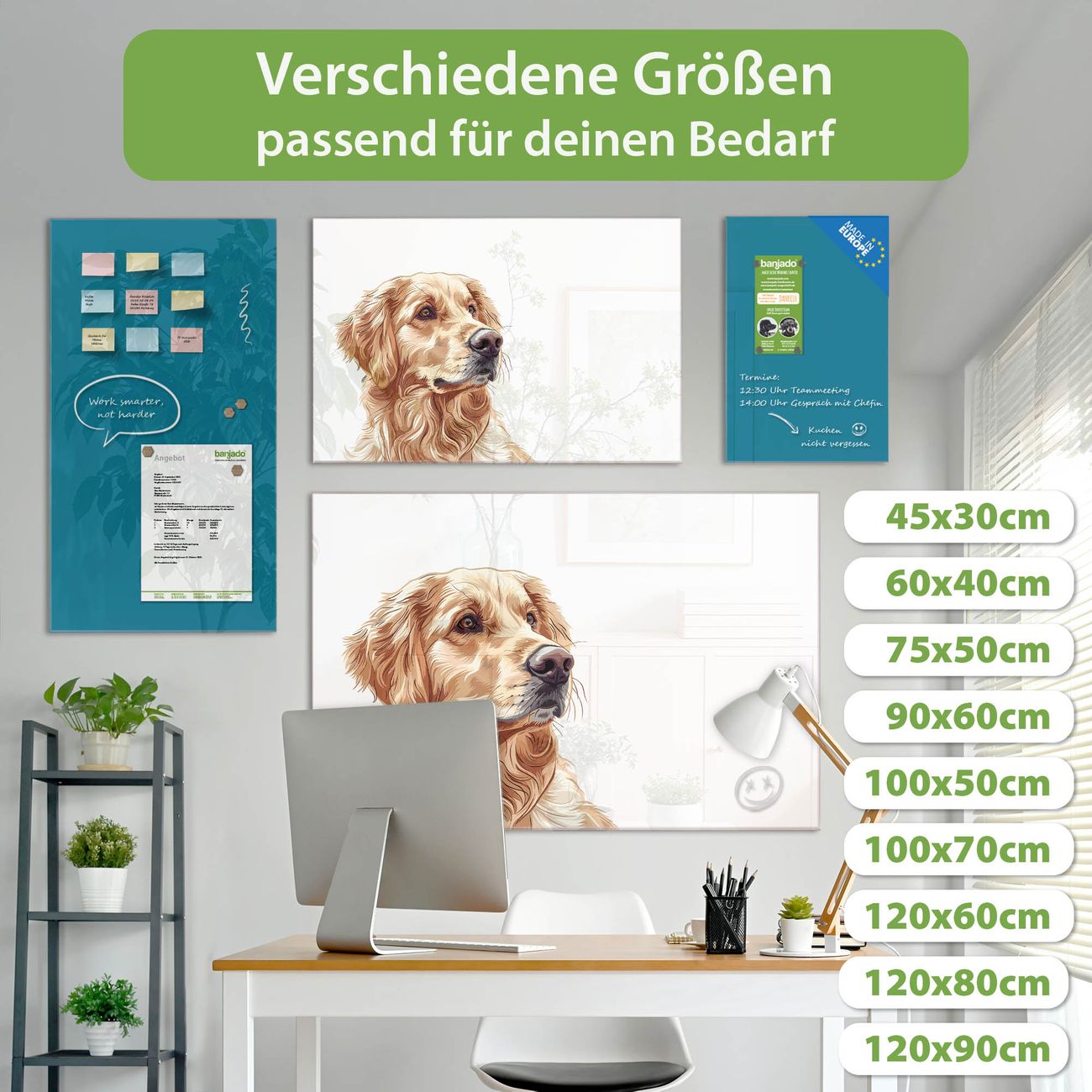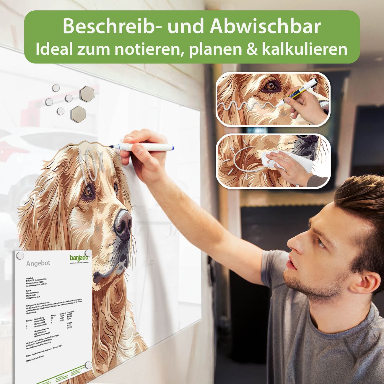 Die banjado Glas Magnettafel mit dem Motiv Motiv Goldener Freund verbindet Funktionalität mit Stil. Sie ersetzt das Zettelchaos durch klare Strukturen und bringt dabei eine warme, natürliche Atmosphäre in Ihr Zuhause. Ob im Büro, in der Küche oder im Eingangsbereich - dieses Design-Board zieht Blicke an und sorgt für Ordnung mit Charakter.