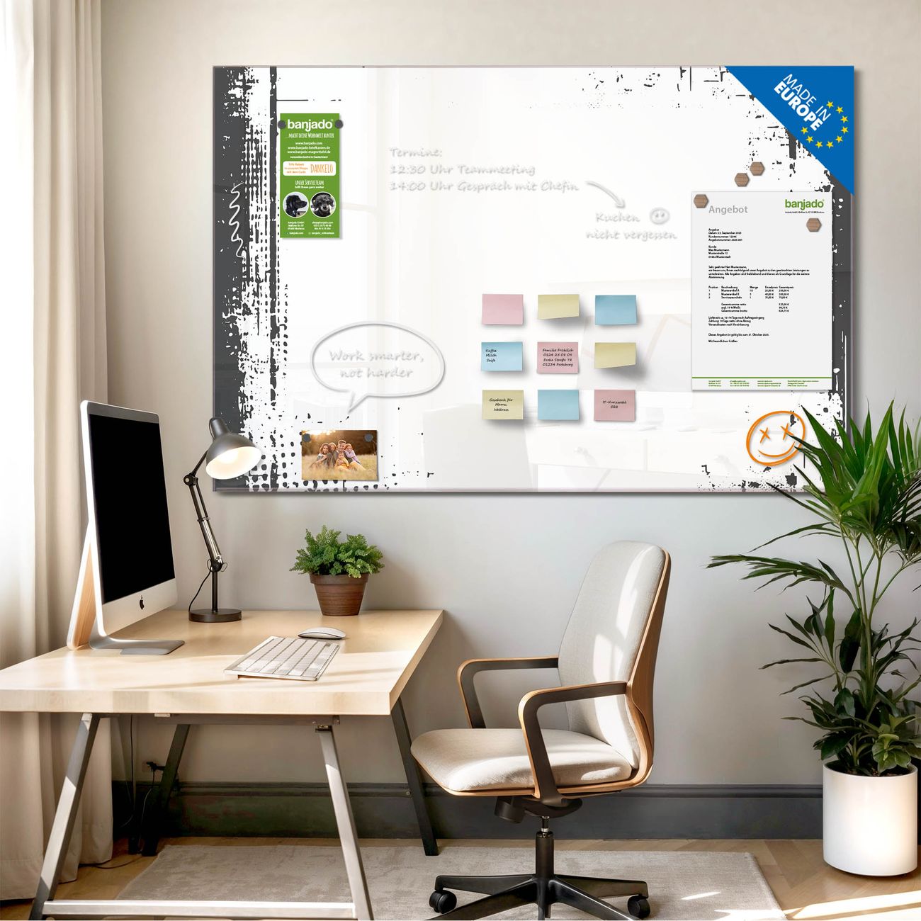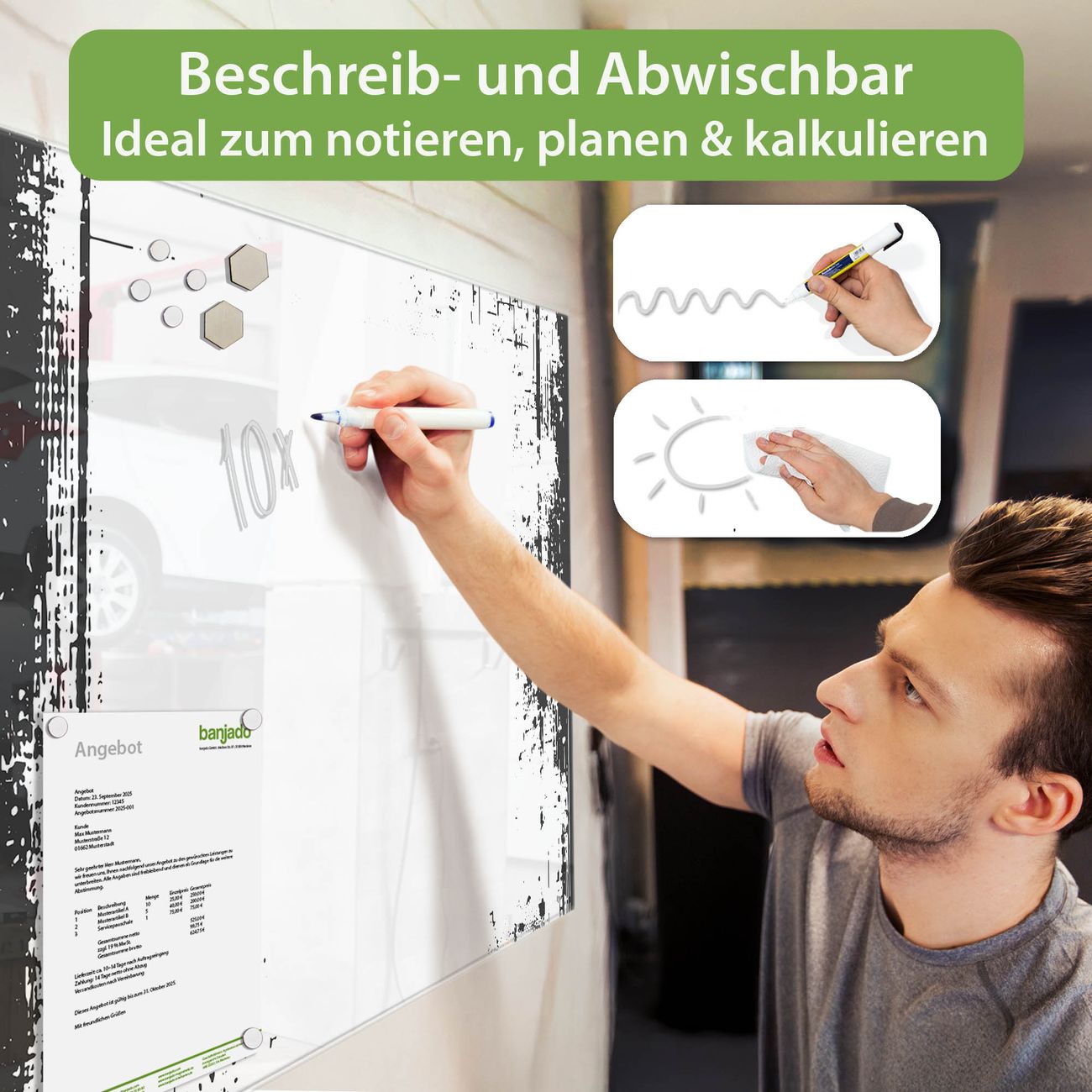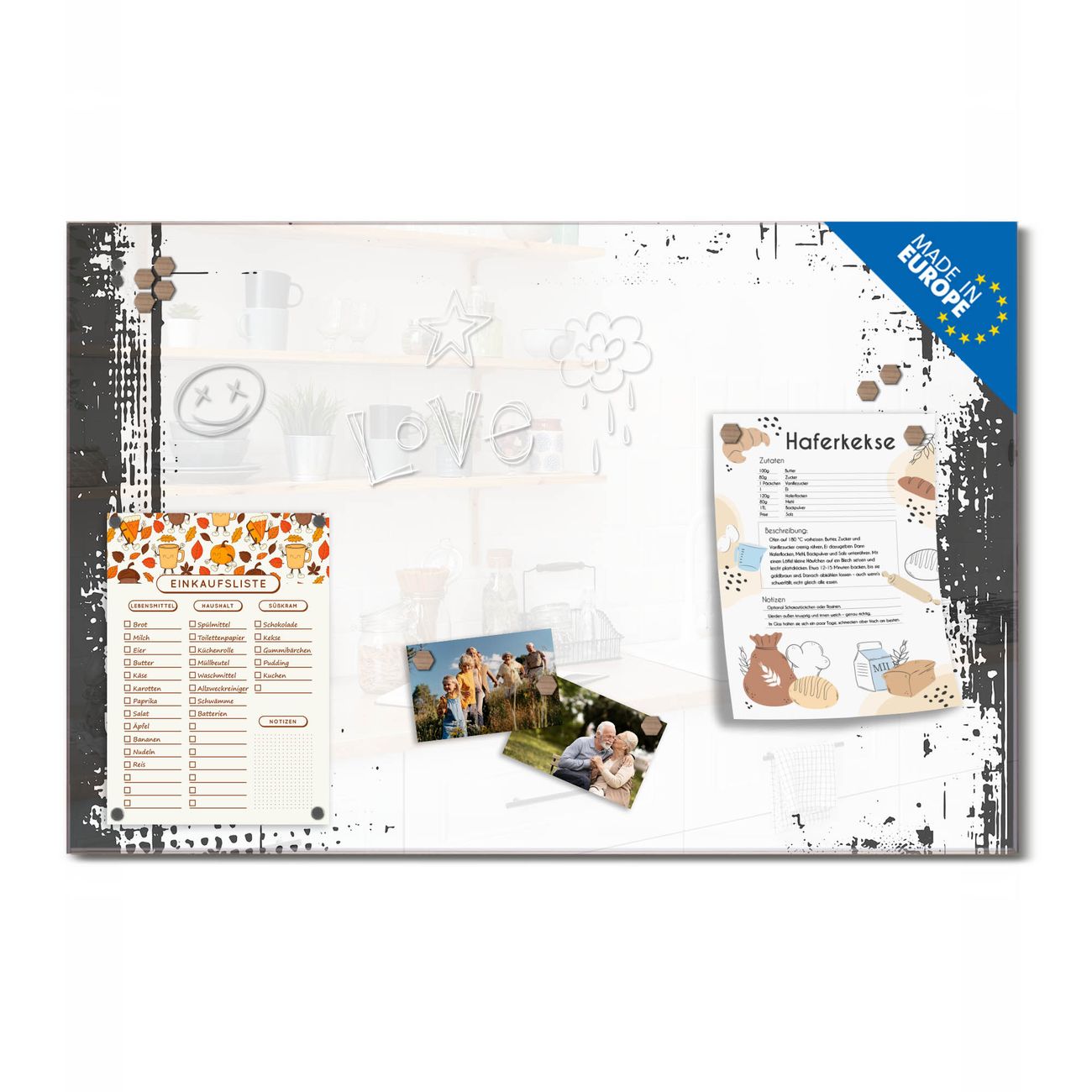 Material: 4mm Sicherheitsglas mit Metallrückwand Eigenschaften: beschreibbar, magnetisch, kratzfest Maße: 90x60x0,6cm, 8,10kg schwer Motiv Nummer 13562 Grunge-Rahmen Zubehör: inklusive 4 Neodym-Magnete