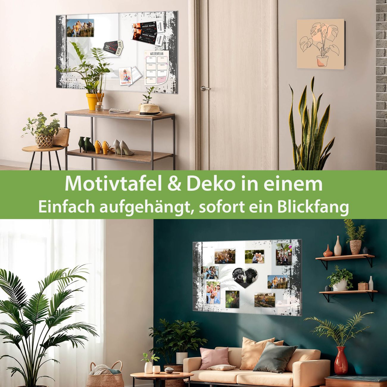 Ein Stück Design, das Ihren Alltag organisiert. Schreiben, heften, inspirieren - alles an einem Ort. Qualität, die man spürt. Montage leicht gemacht. Handwerk mit Herz - veredelt in Sachsen. Einzigartiges Design mit Motiv Motiv Grunge-Rahmen Beschreibbare Glasoberfläche, leicht zu reinigen Starke Magnetkraft durch Stahlrückwand Inklusive 4 Neodym-Magneten Flexible Montageoptionen Handveredelt in Sachsen - Qualität, die bleibt