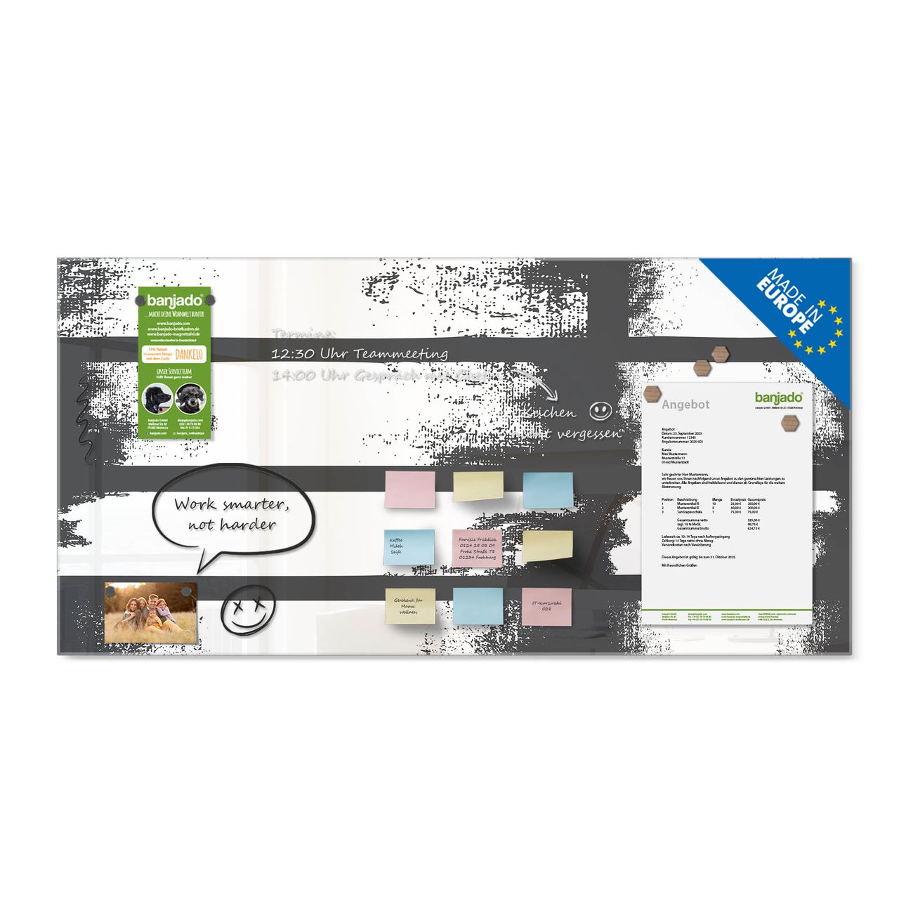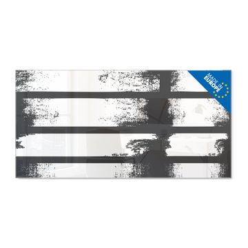 Material: 4mm Sicherheitsglas mit Metallrückwand Eigenschaften: beschreibbar, magnetisch, kratzfest Maße: 100x50x0,6cm, 7,50kg schwer Motiv Nummer 13142 Grunge Streifen Zubehör: inklusive 4 Neodym-Magnete