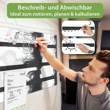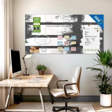 Ein Stück Design, das Ihren Alltag organisiert. Schreiben, heften, inspirieren - alles an einem Ort. Qualität, die man spürt. Montage leicht gemacht. Handwerk mit Herz - veredelt in Sachsen. Einzigartiges Design mit Motiv Motiv Grunge Streifen Beschreibbare Glasoberfläche, leicht zu reinigen Starke Magnetkraft durch Stahlrückwand Inklusive 4 Neodym-Magneten Flexible Montageoptionen Handveredelt in Sachsen - Qualität, die bleibt