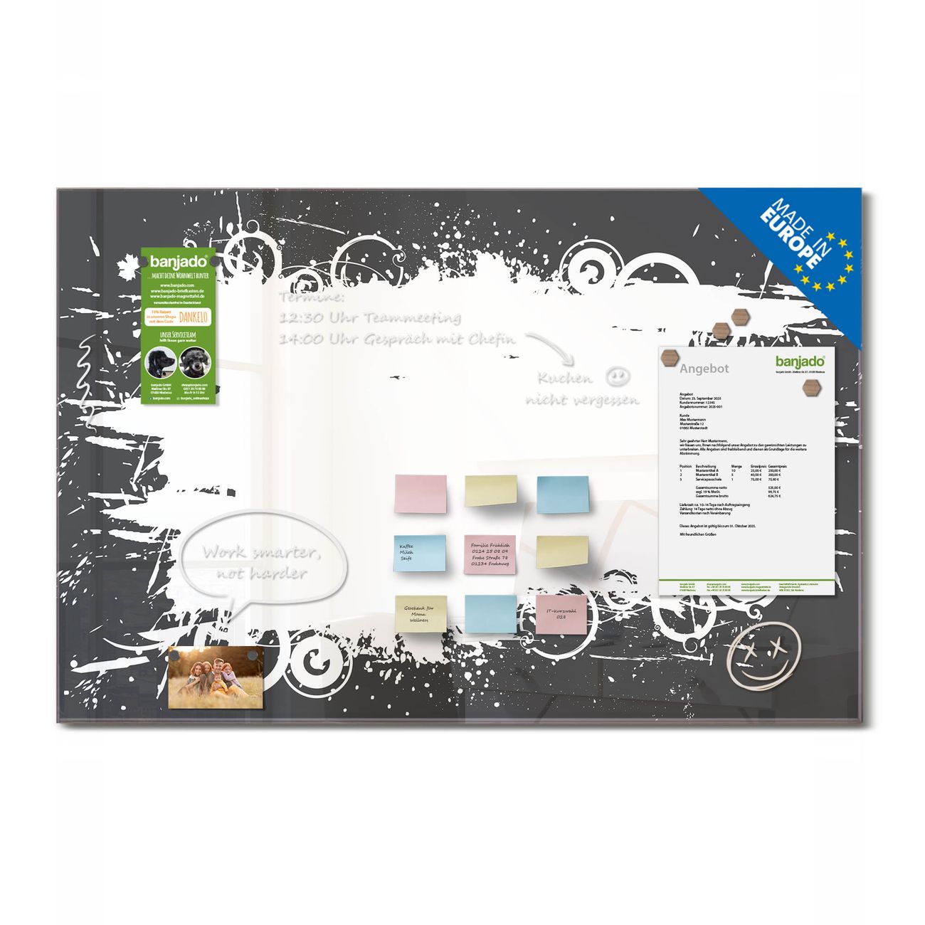 Material: 4mm Sicherheitsglas mit Metallrückwand Eigenschaften: beschreibbar, magnetisch, kratzfest Maße: 120x80x0,6cm, 14,40kg schwer Motiv Nummer 13565 Grunge Swirl Hintergrund Zubehör: inklusive 4 Neodym-Magnete