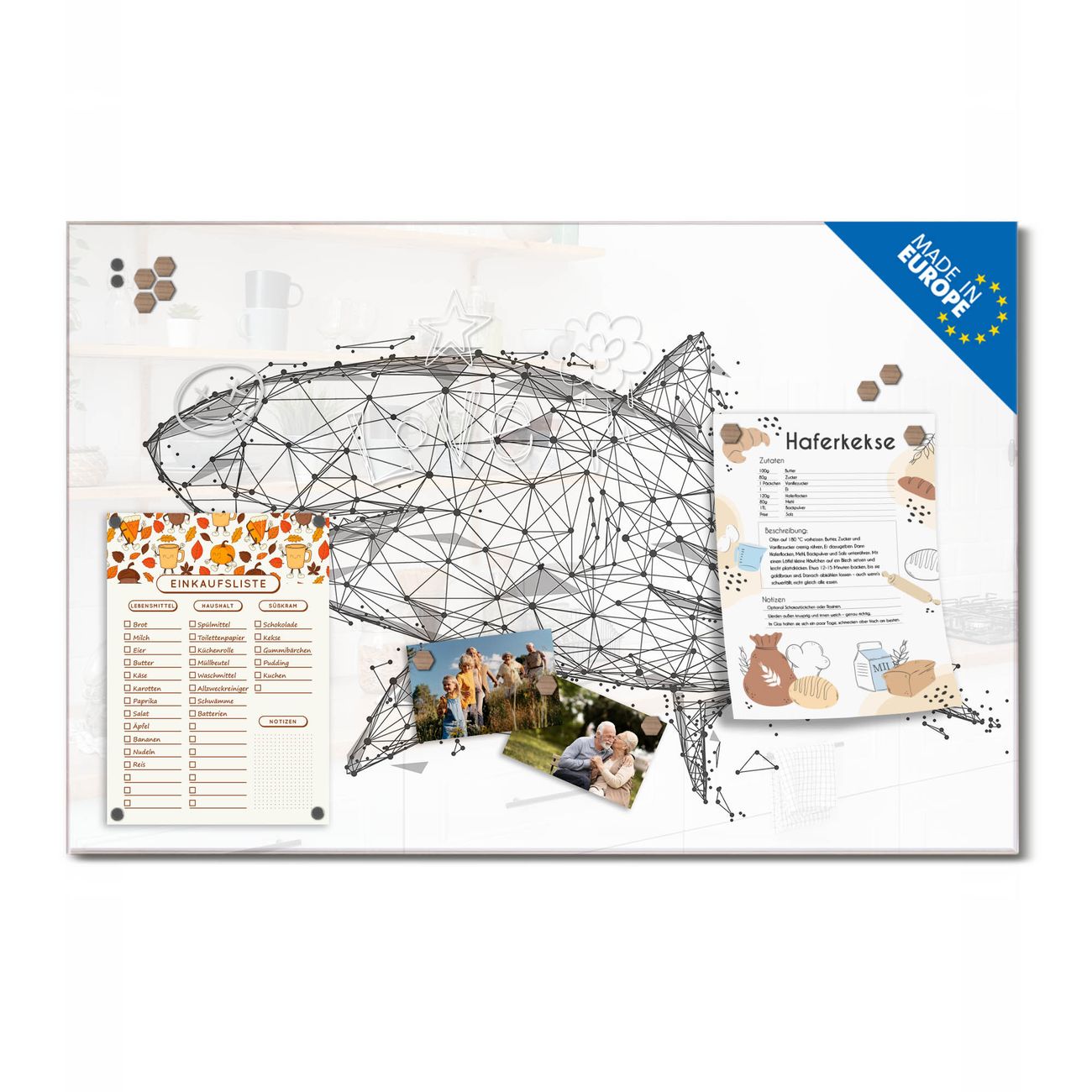 Material: 4mm Sicherheitsglas mit Metallrückwand Eigenschaften: beschreibbar, magnetisch, kratzfest Maße: 90x60x0,6cm, 8,10kg schwer Motiv Nummer 13025 Hai abstrakt 2 Zubehör: inklusive 4 Neodym-Magnete